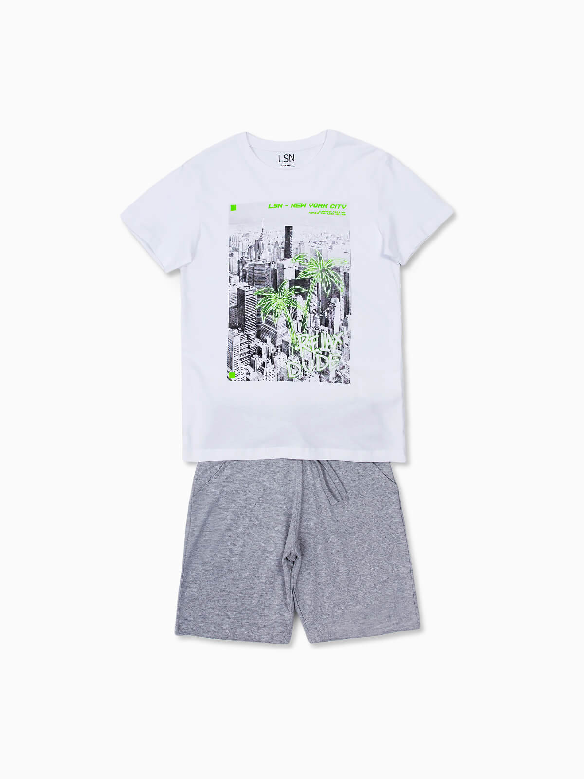 Conjunto de 2 peças para menino. T-shirt de manga curta com estampado na frente. Gola redonda. Calções de malha com cintura elástica e cordão para ajustar. 2 bolsos.