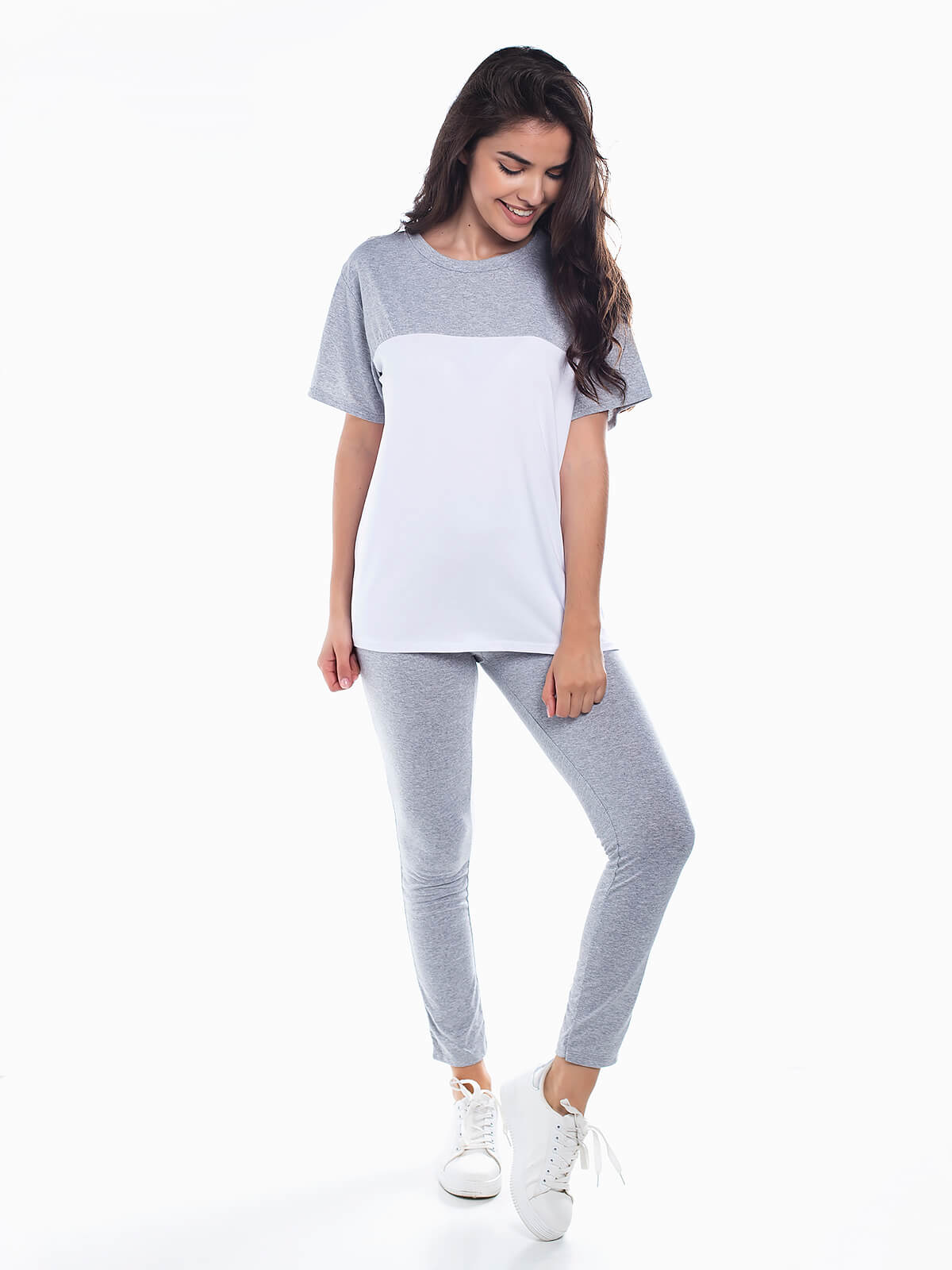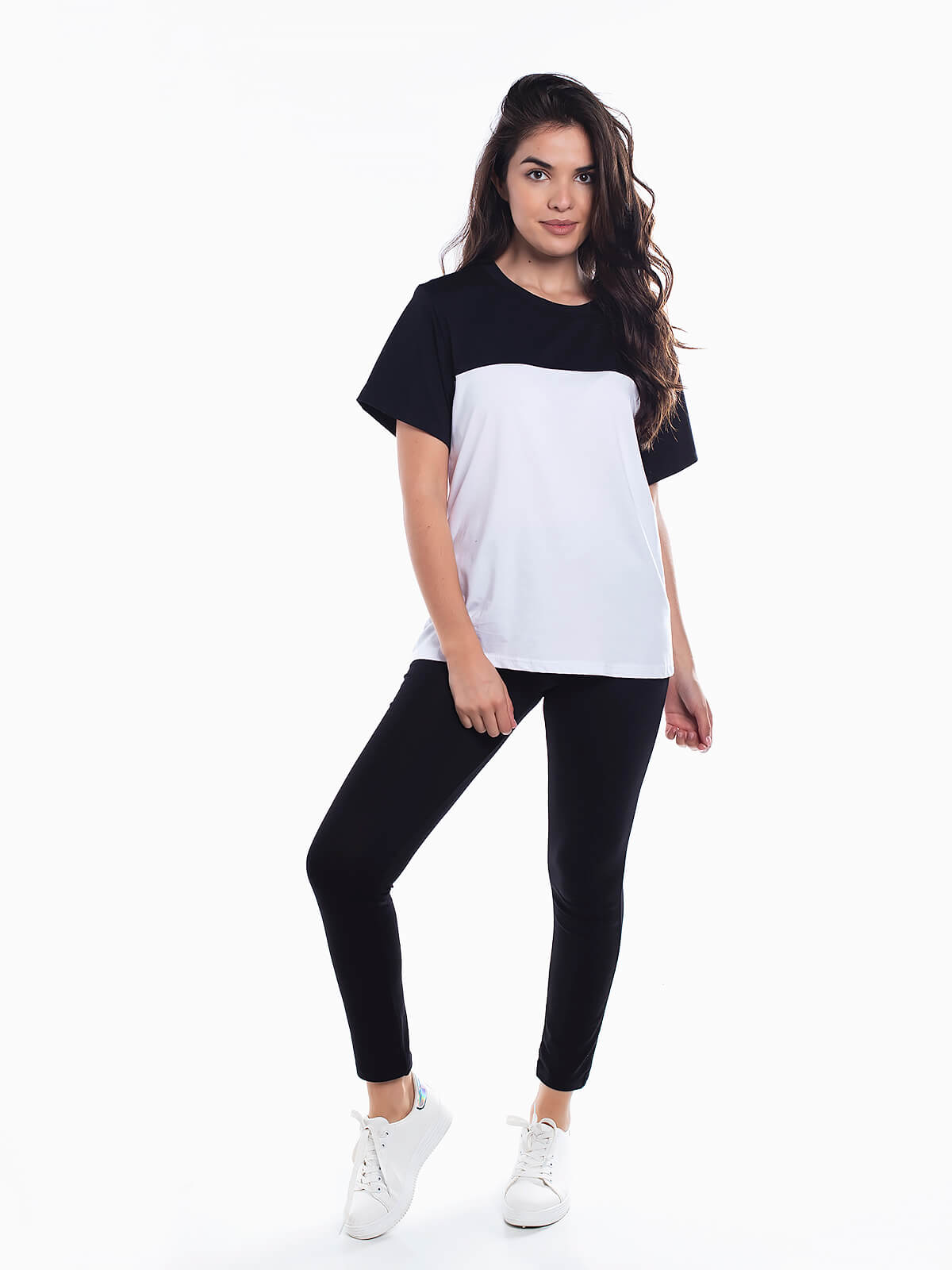 Conjunto de 2 peças. T-shirt bicolor de manga curta com gola redonda. Leggings cintura alta elástica.