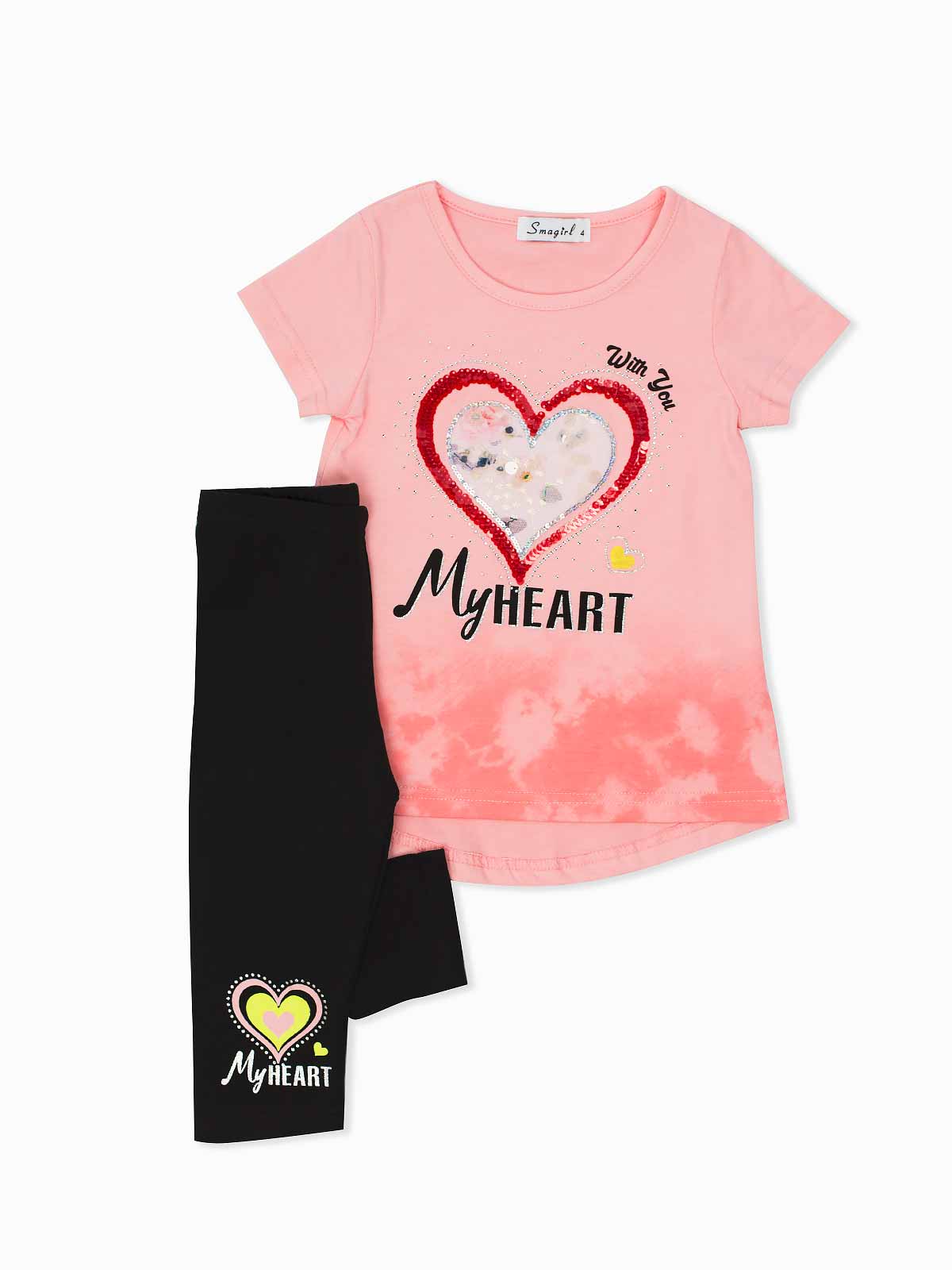 Conjunto de 2 peças para menina. T-shirt manga curta estampada com lantejoulas. Corsários pretos elásticos My heart.