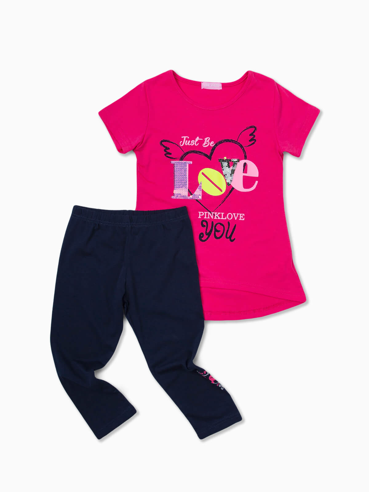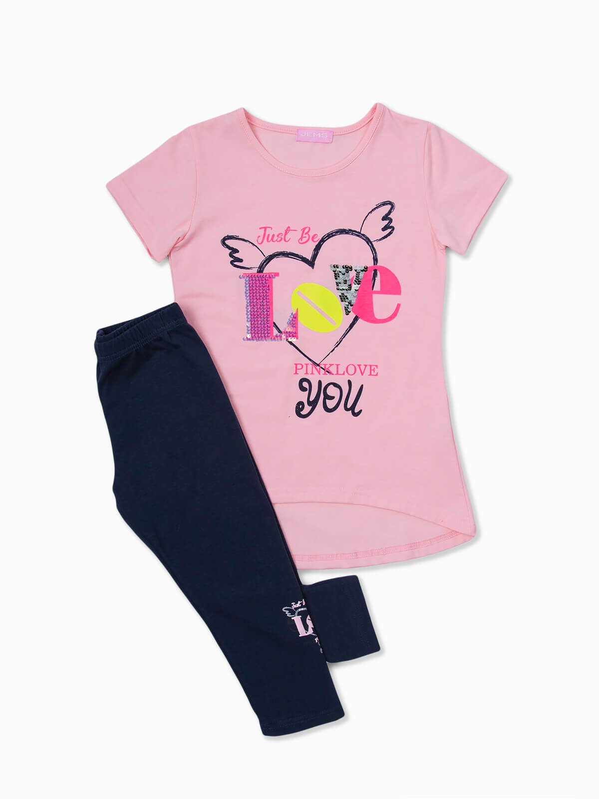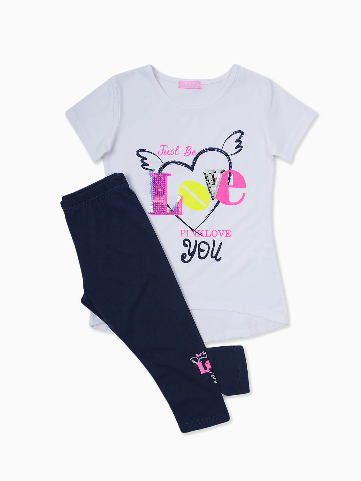 T-shirt manga curta com estampado de letras e lantejoulas aplicadas. Cós arredondado mais comprido atrás. Leggings curtas estampadas com cintura elástica.