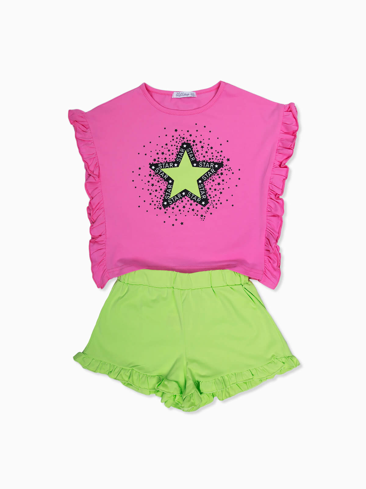 Conjunto composto por 2 peças para menina. T-shirt sem mangas com folhos aplicados nas laterais. T-shirt estampada de gola redonda. Calções de cintura elástica com folhos na base.