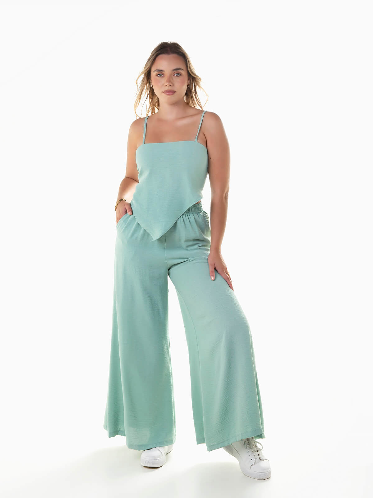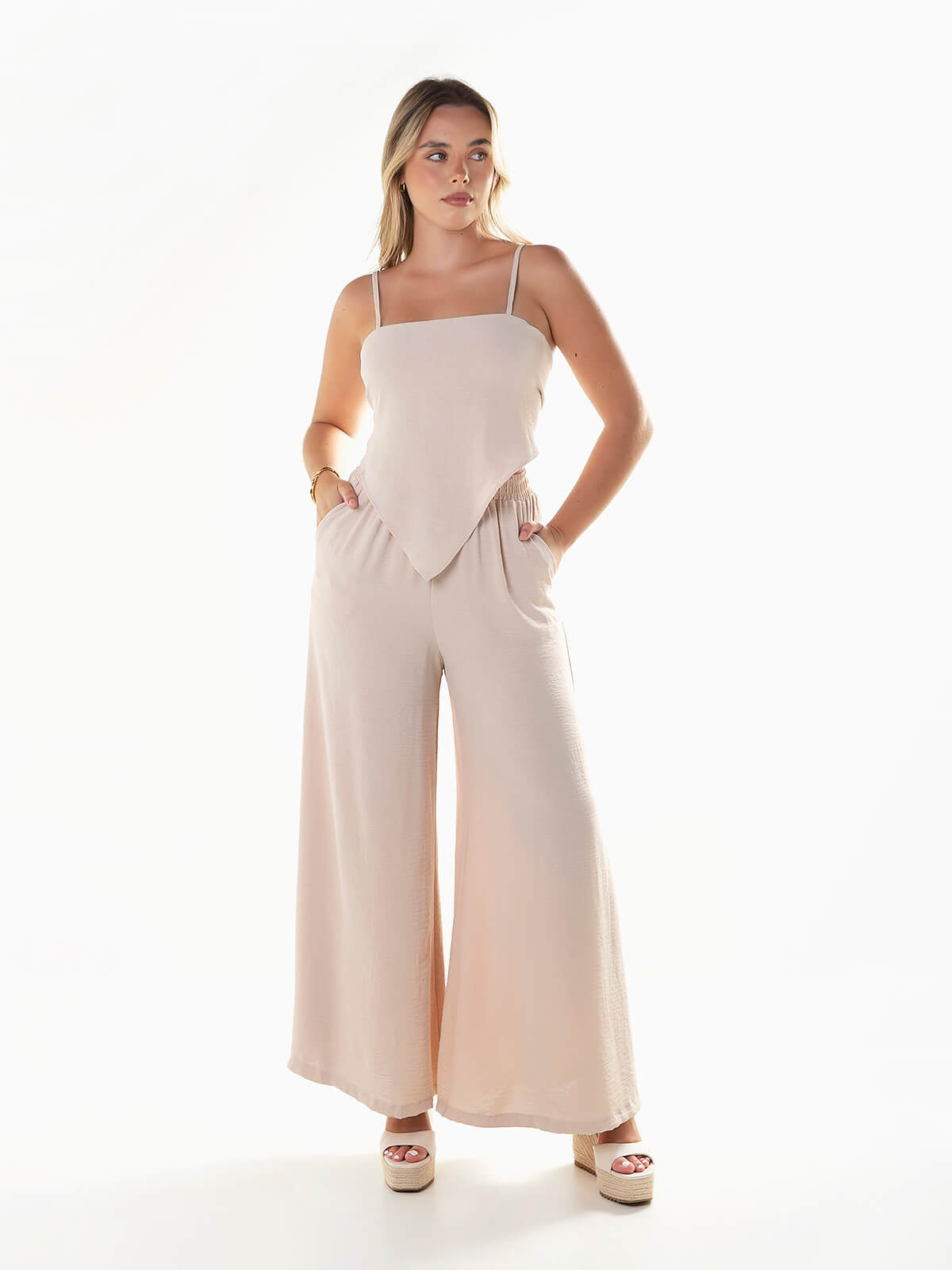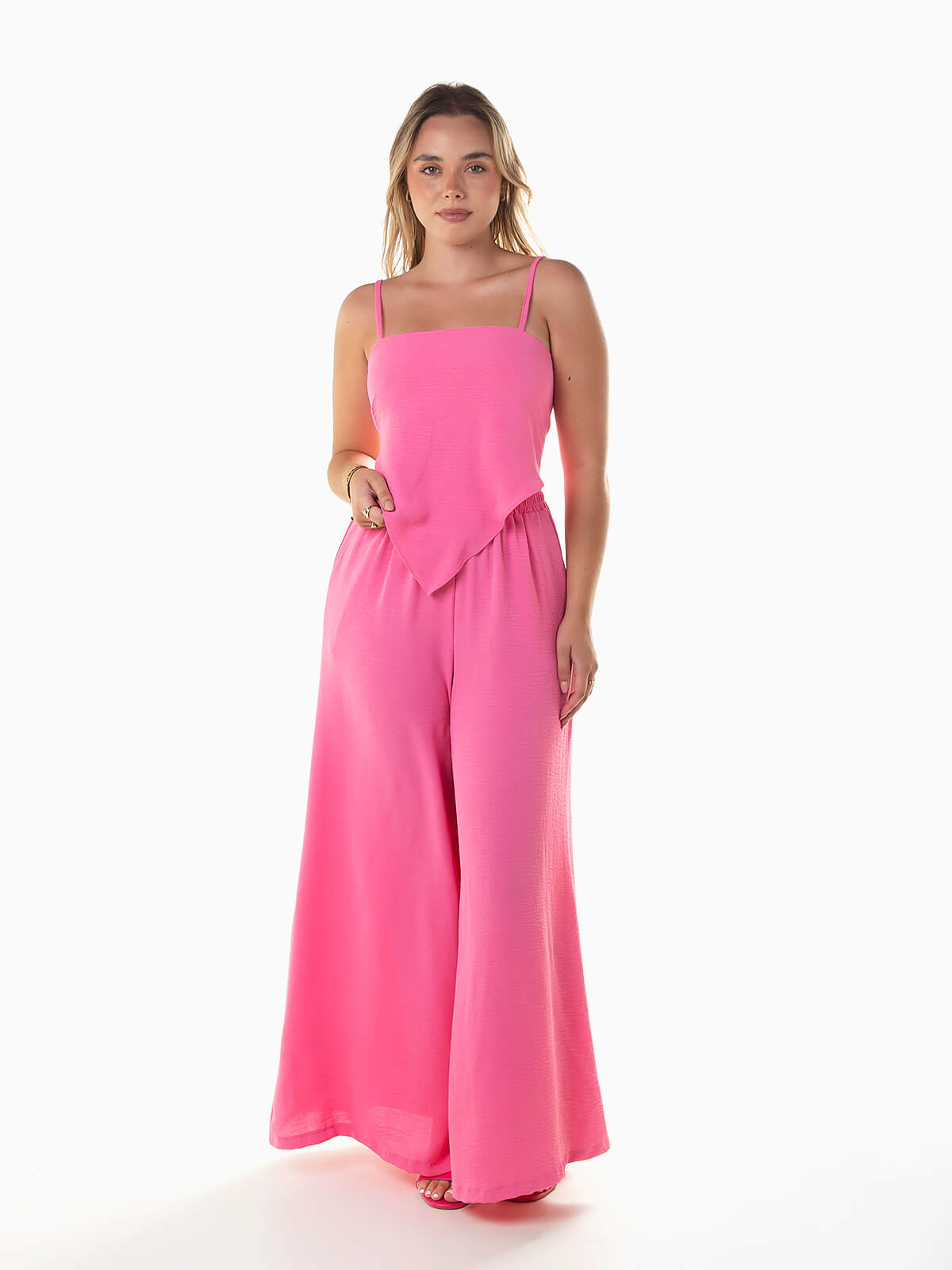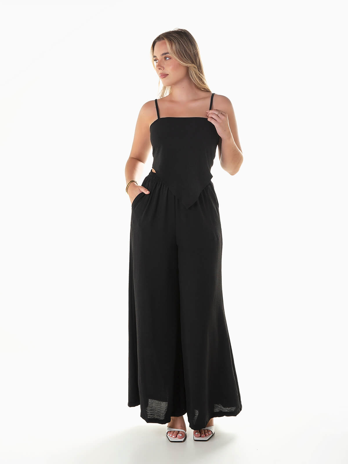 Conjunto fluído 2 peças. Top com alças finas reguláveis e aperto posterior de laço. Decote quadrado e base em V. Calças palazzo com cintura alta elástica e 2 bolsos.