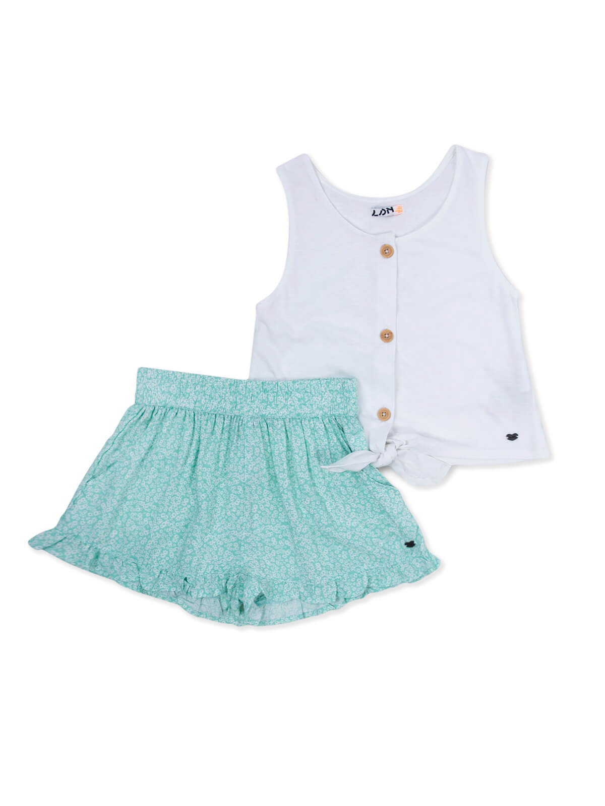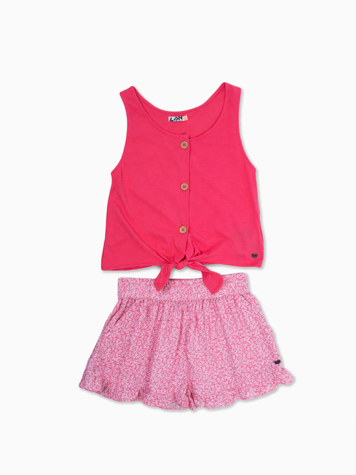 Conjunto de duas peças para menina. Top com nó na base. Decote redondo e aperto frontal de botões. Calções fluídos com flores e folho na base. Cintura elástica e 2 bolsos.
