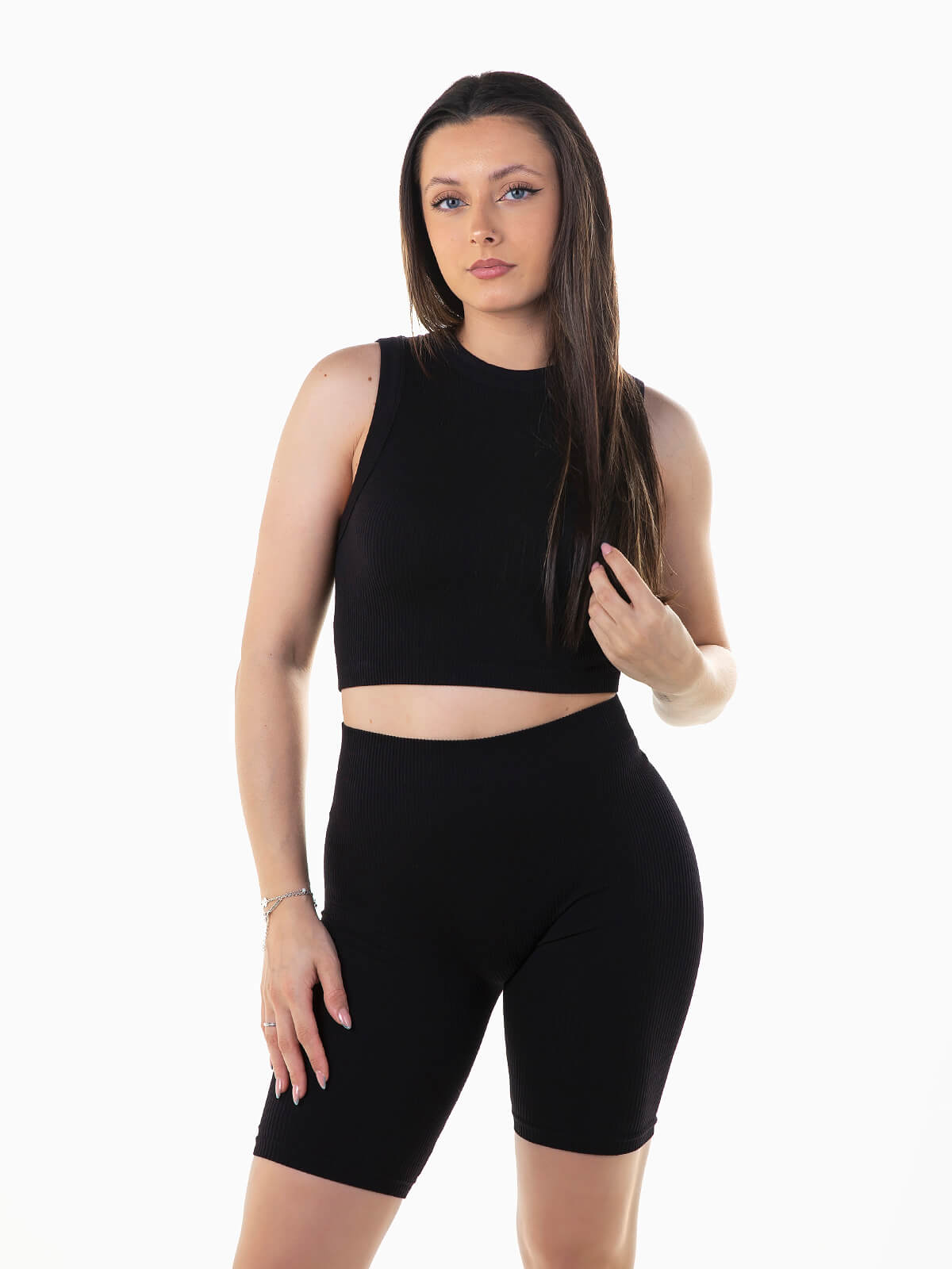Conjunto elástico em malha canelada. Top curto de manga cava com decote redondo. Calções curtos de cintura alta.