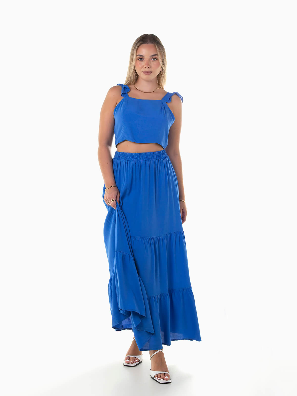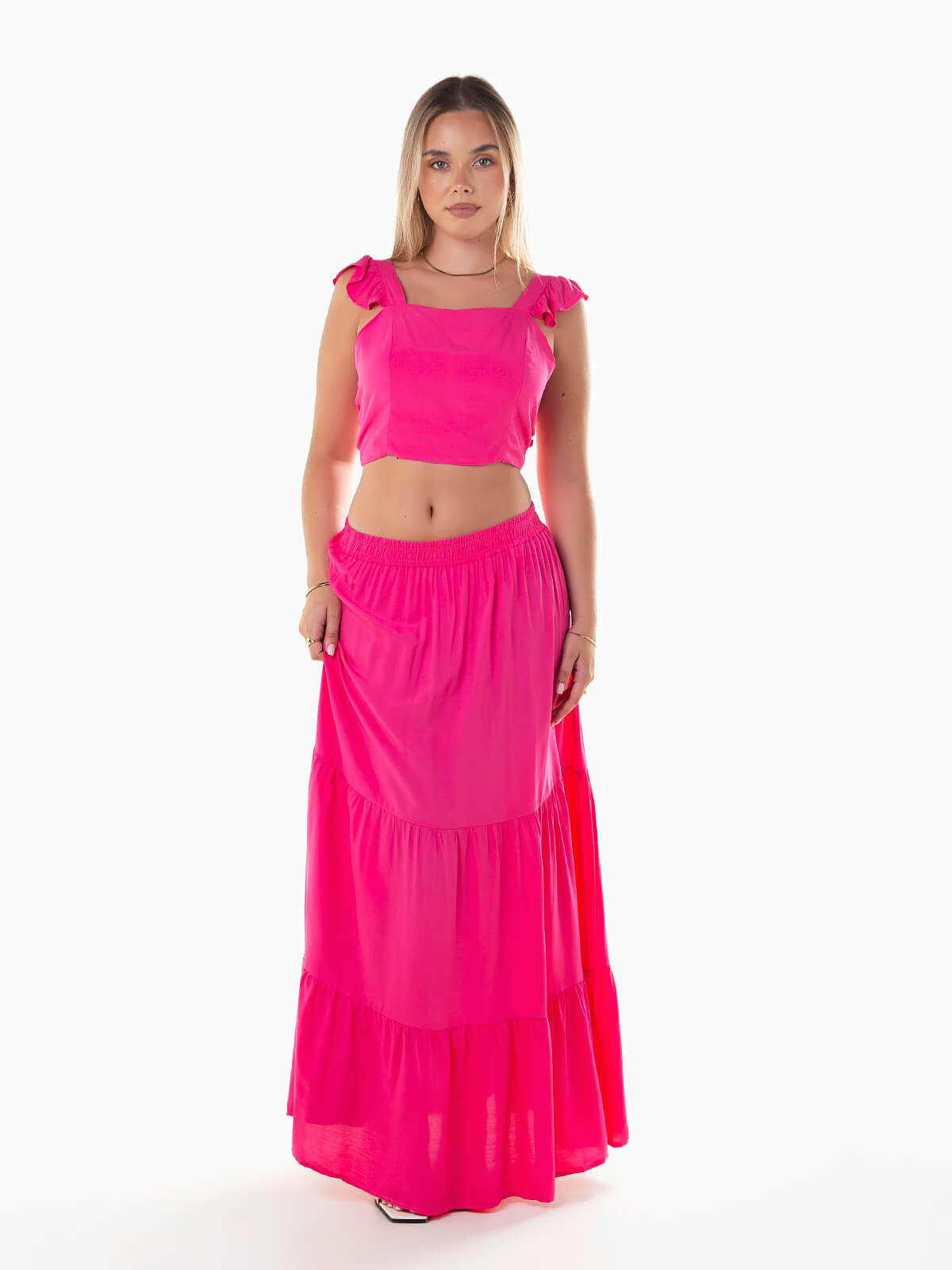 Conjunto fluído 2 peças. Top curto de alças com encaixe de folhos e costas descobertas. Aperto posterior de laço. Saia comprida de cintura alta elástica com painéis.