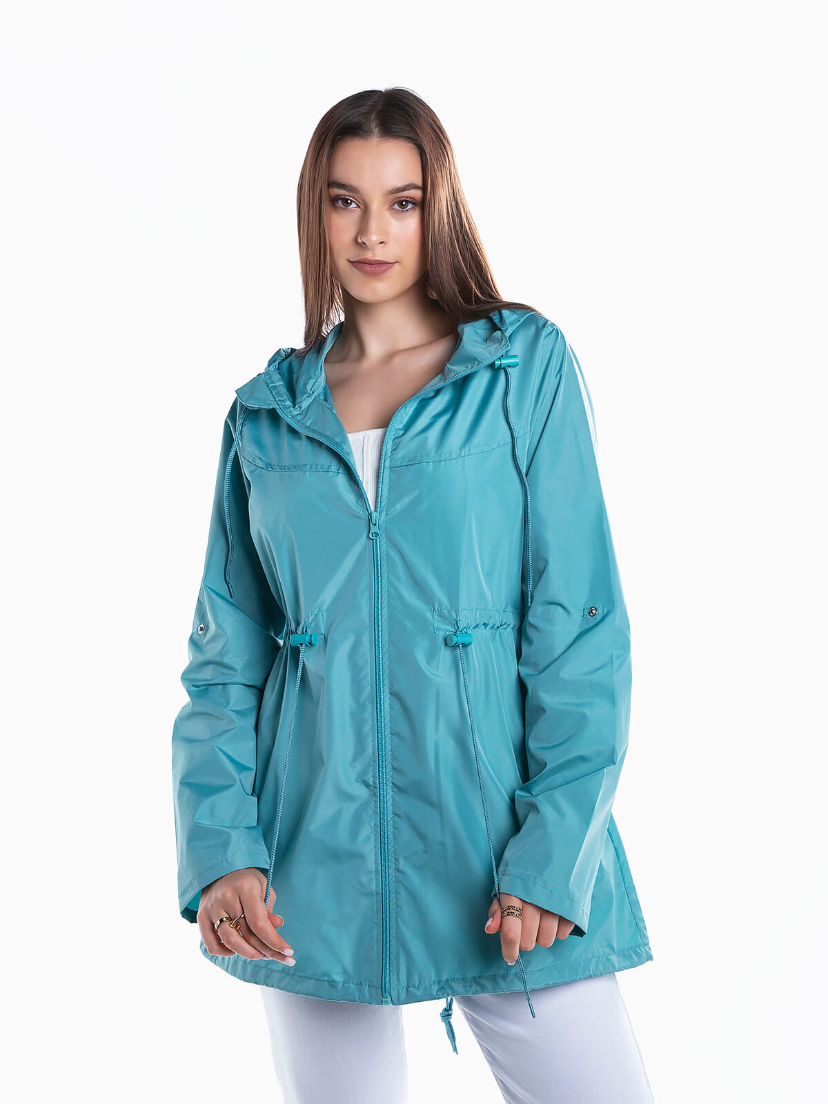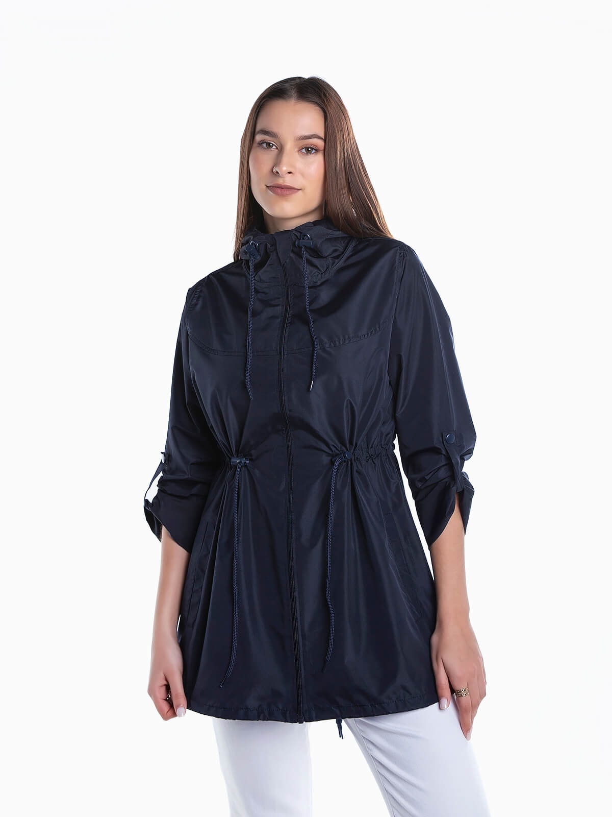 Corta-vento impermeável com capuz para senhora. Manga comprida com presilhas. Cordão aplicado no capuz, cintura e base para ajustar. Gola subida. Aperto frontal de fecho zíper.