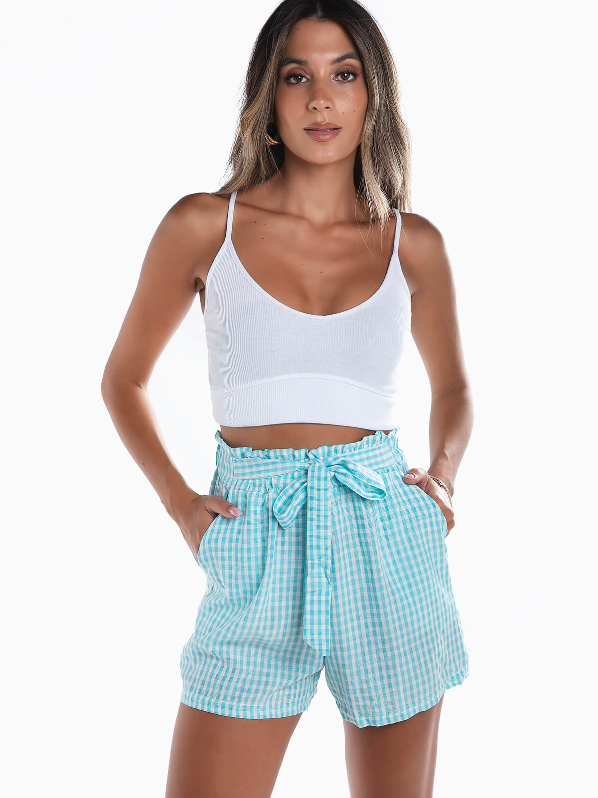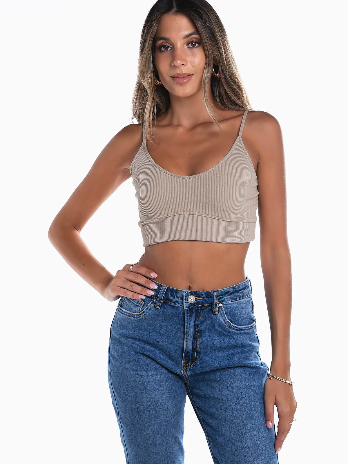 Crop top alças em malha canelada para senhora. Top para senhora com decote redondo.