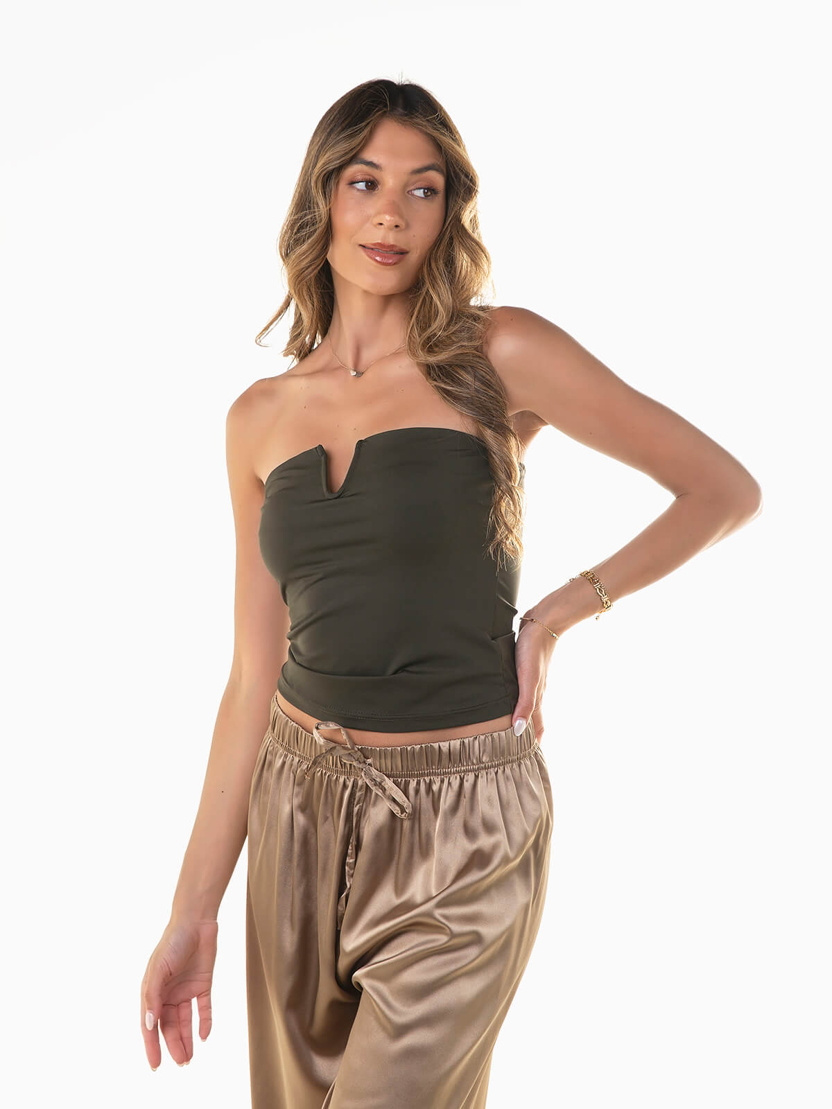 Crop top elástico para senhora. Top decote bandeau com peça metálica em forma de v forrada.