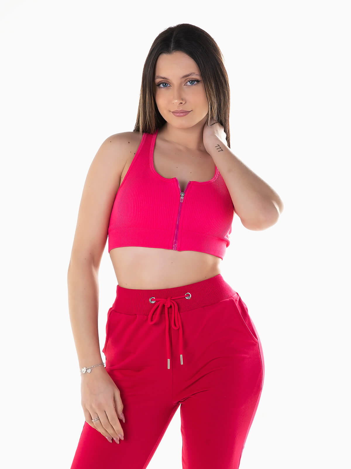 Crop top elástico em tecido canelado com aperto frontal de fecho zíper. Top desportivo manga cava com costas de natação. Peito almofadado.