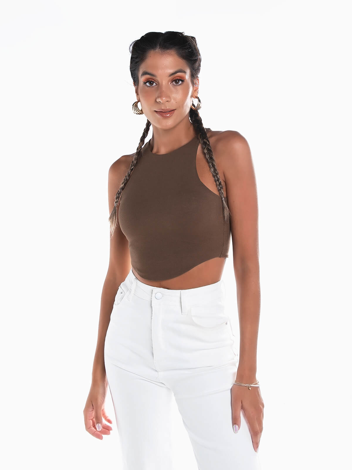 Crop top castanho com decote halter para senhora. Top malha sem mangas com peito almofadado e base arredondada.