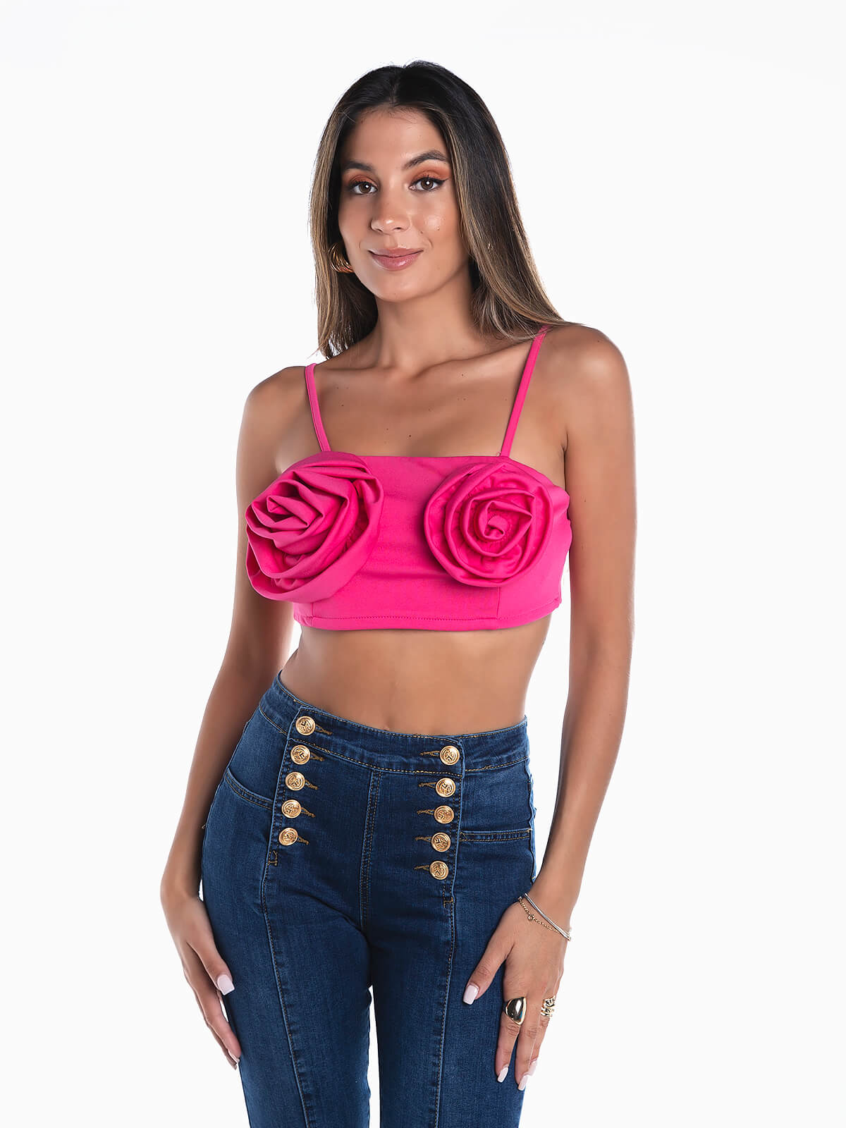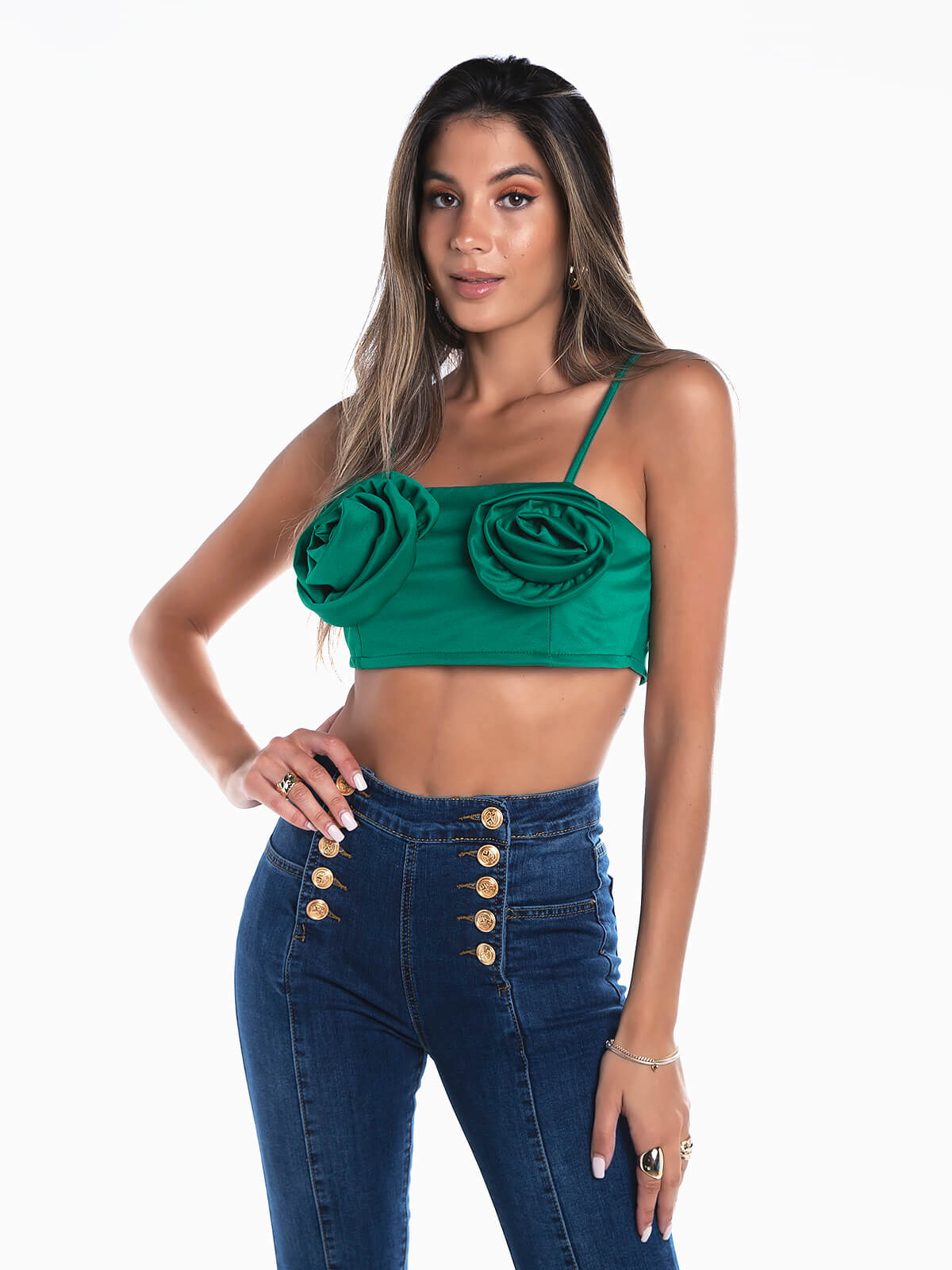 Crop top com aplicações de tecido em forma floral. Alças finas.