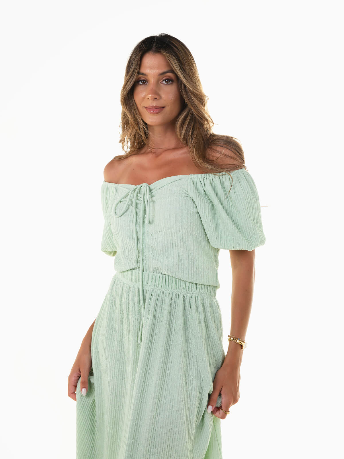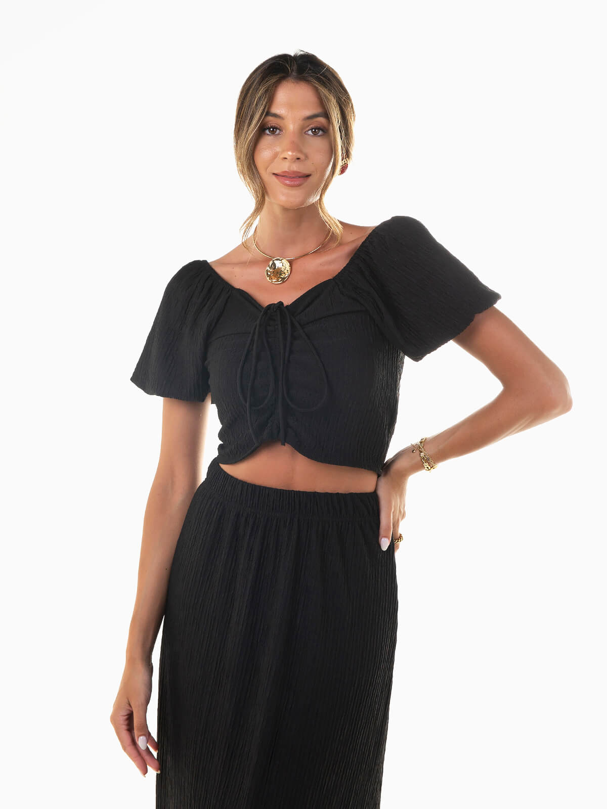 Crop top em tecido com textura para mulher. Top manga curta com decote barco. Cordão para ajustar que dá versatilidade à peça. Combine com a saia a condizer para um conjunto elegante e descontraído, ideal para várias ocasiões.