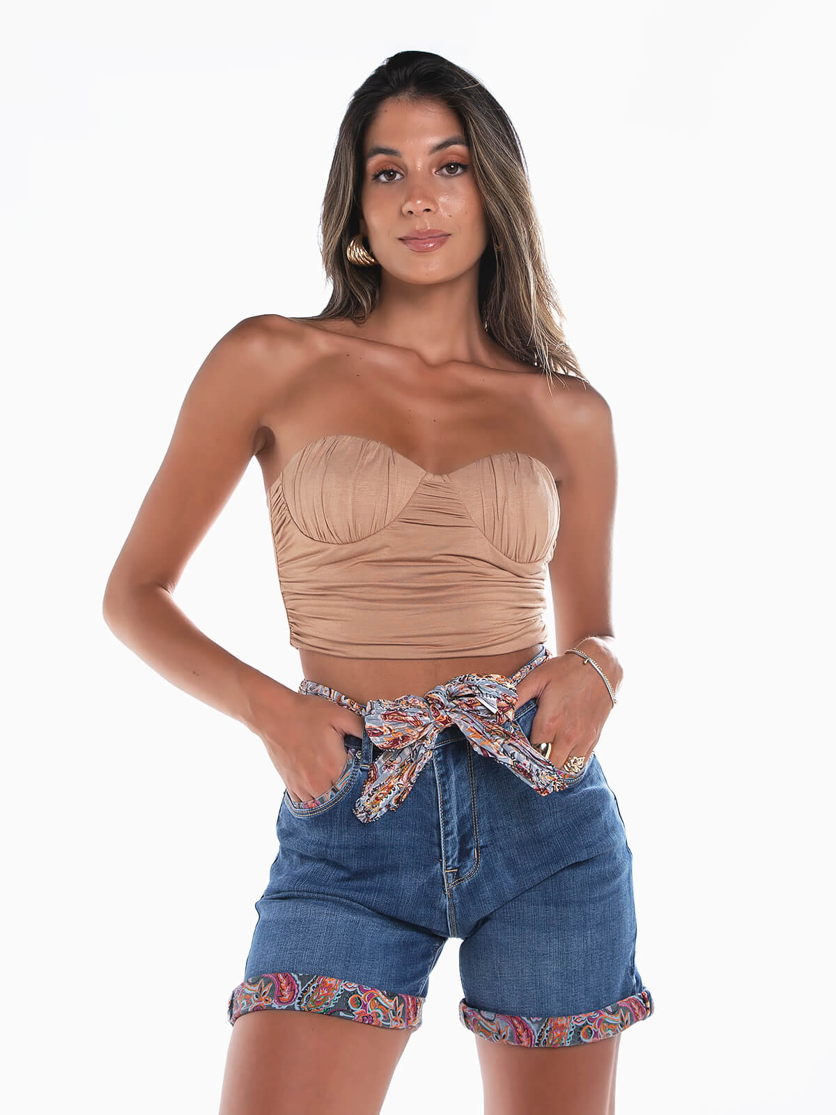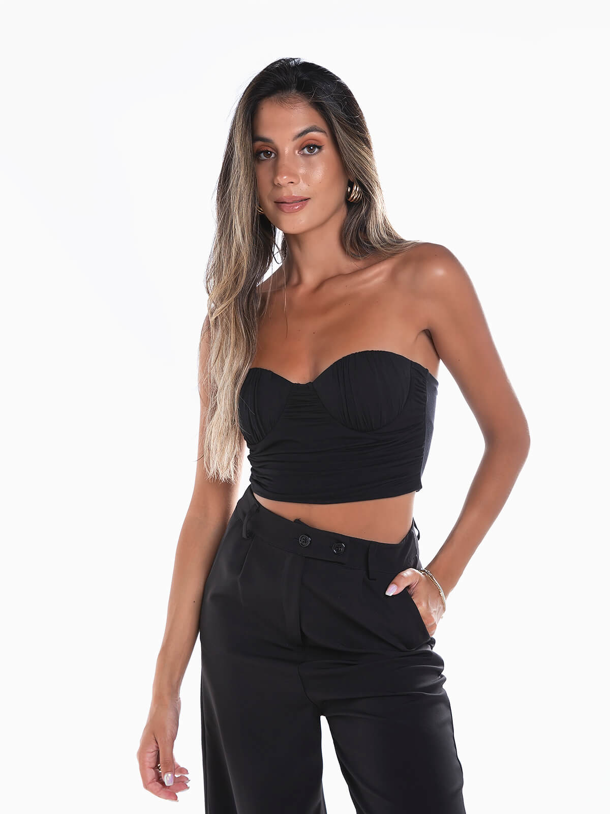 Crop top caicai com decote coração para senhora. Top bandeau almofadado com franzidos e aperto posterior de fecho éclair.