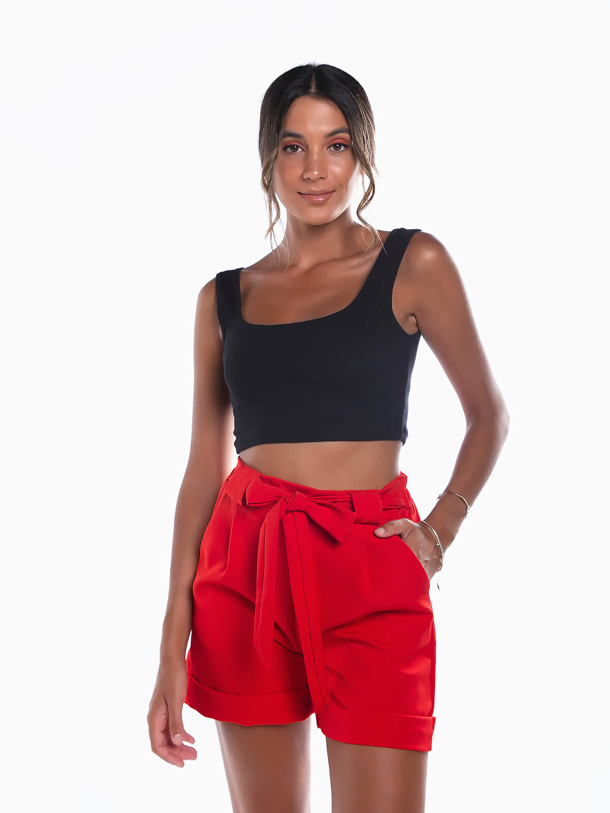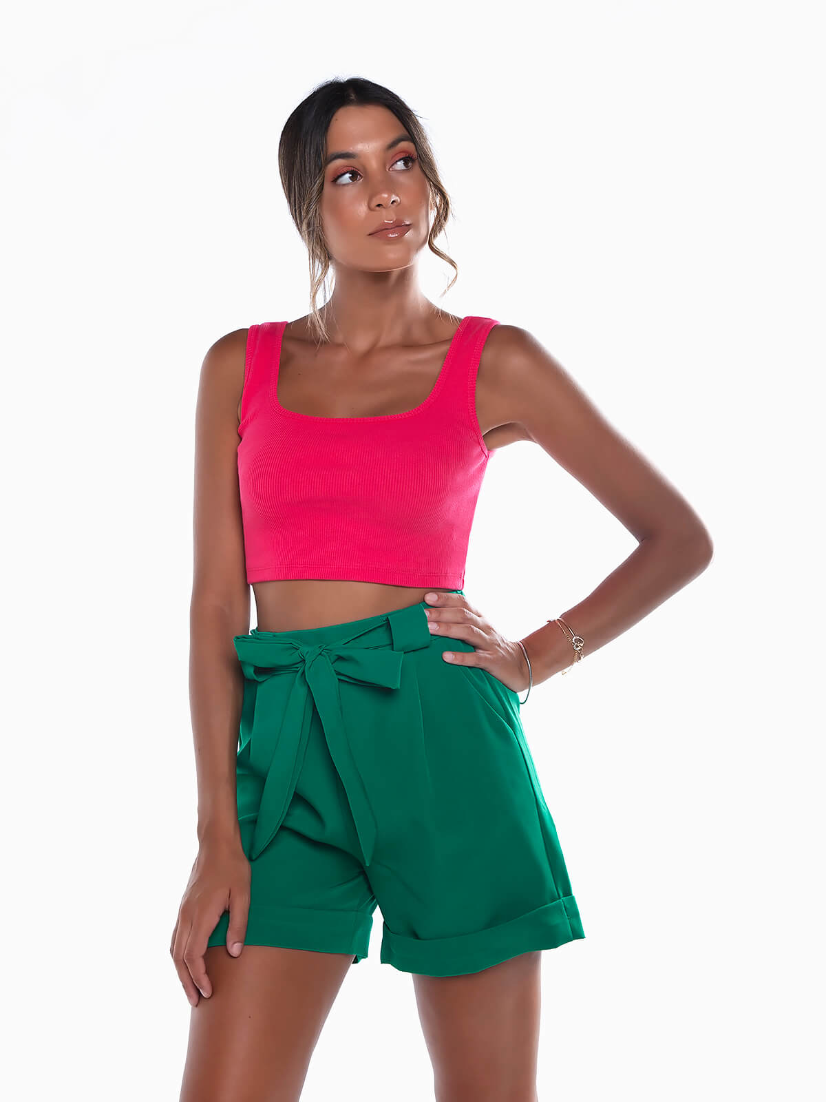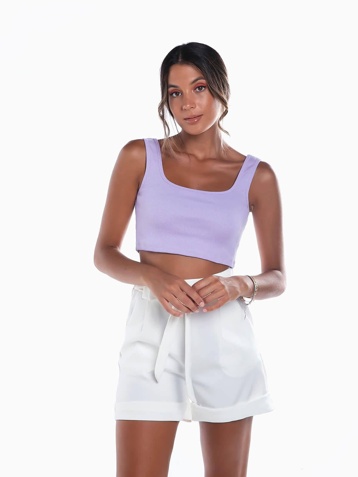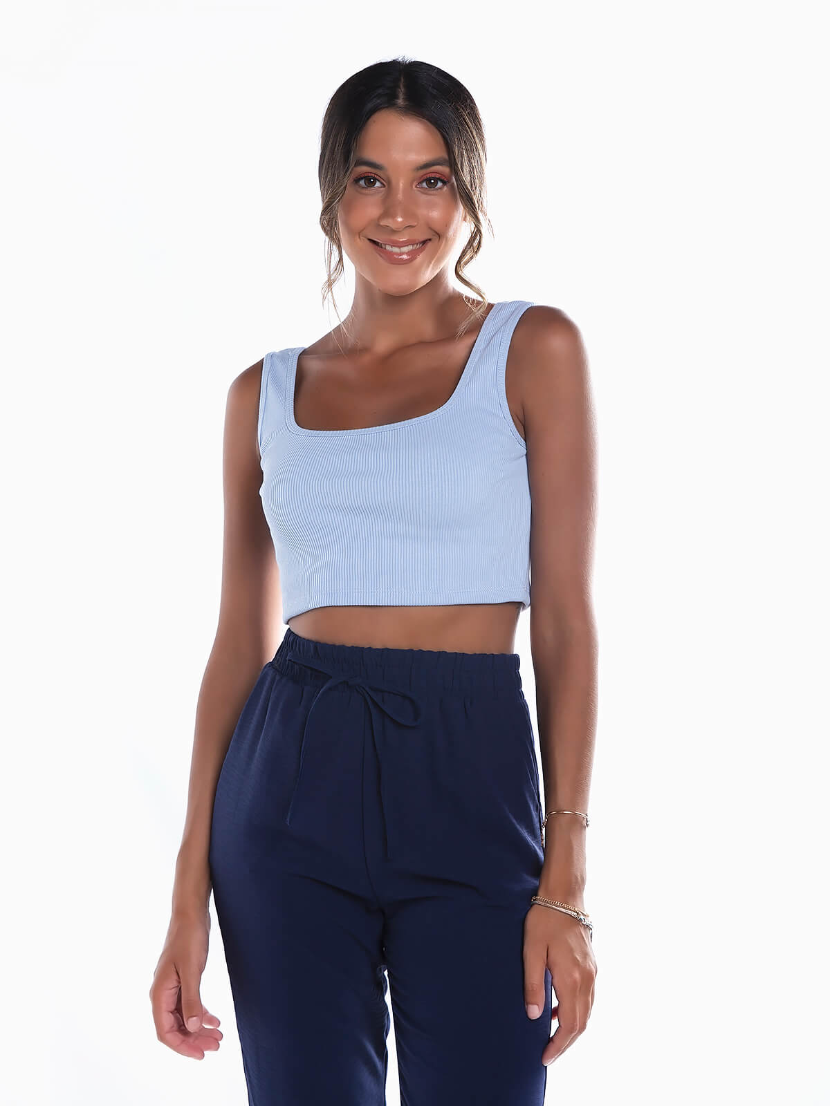 Crop top em malha canelada para senhora. Top justo de alças largas com decote quadrado.