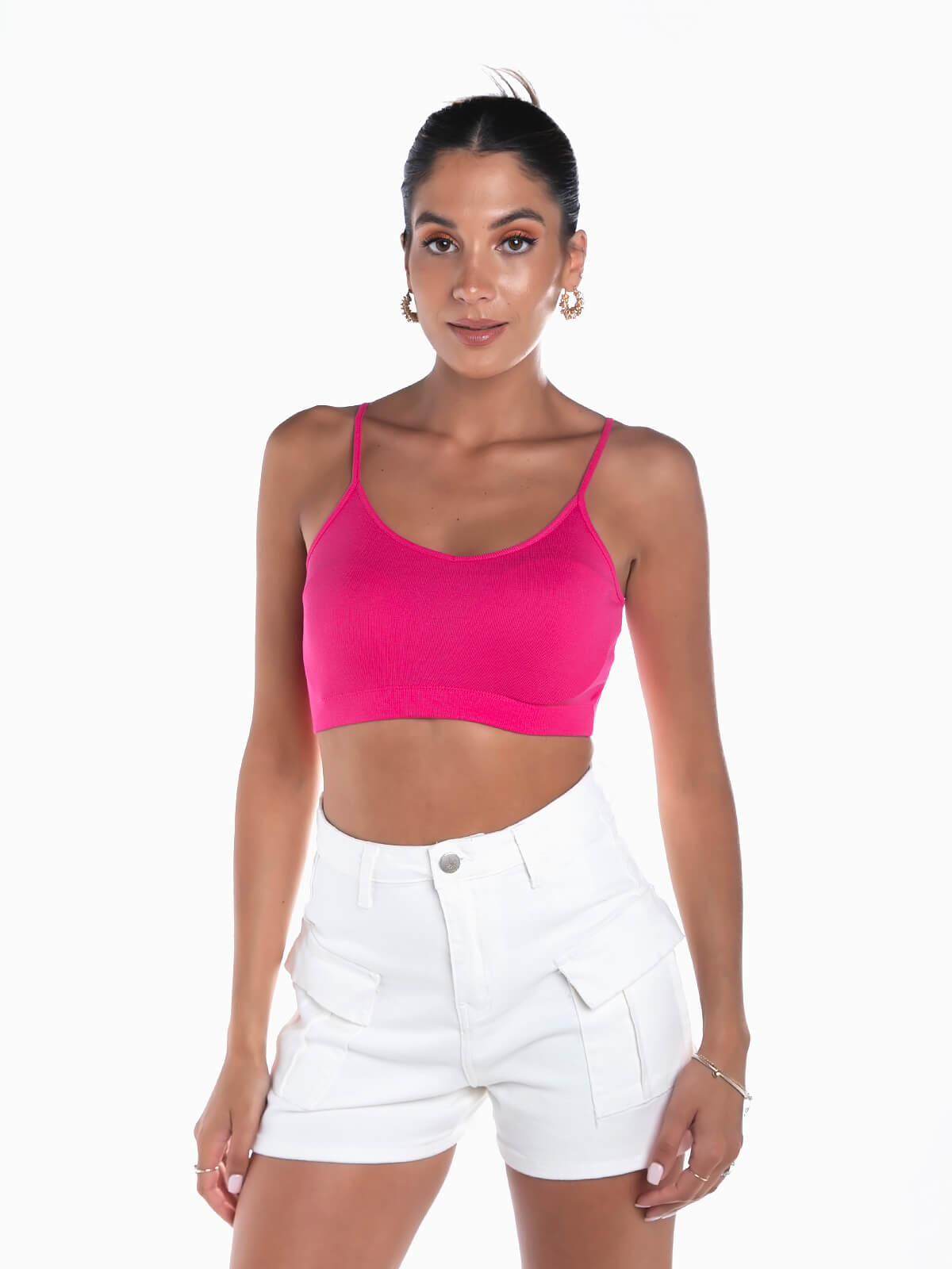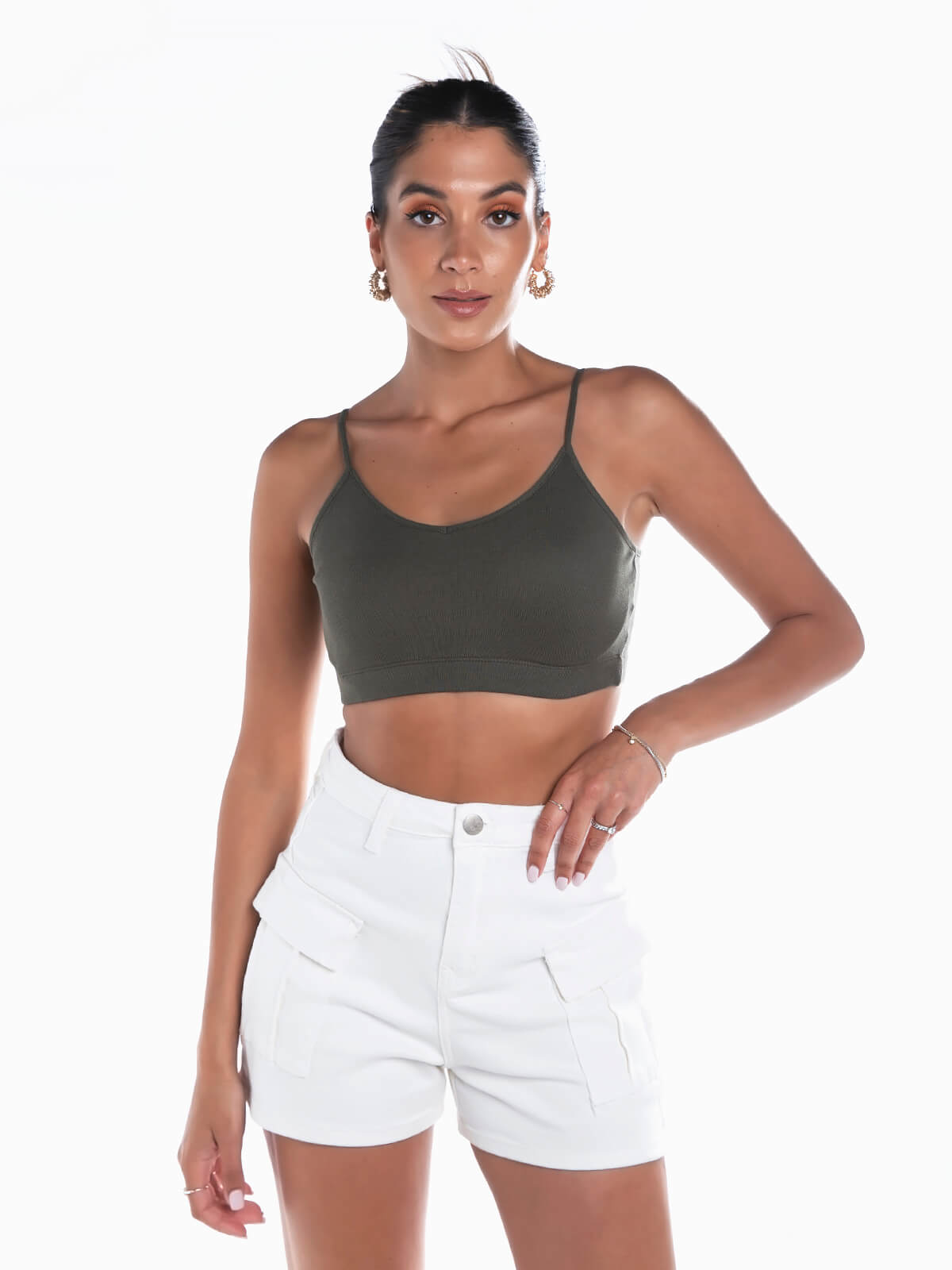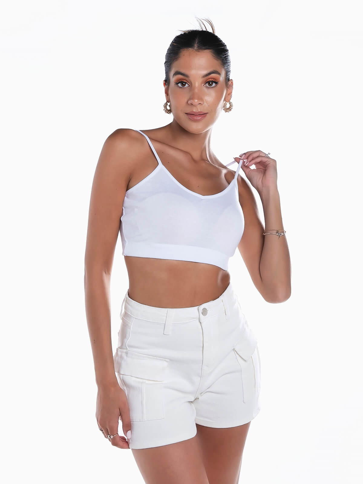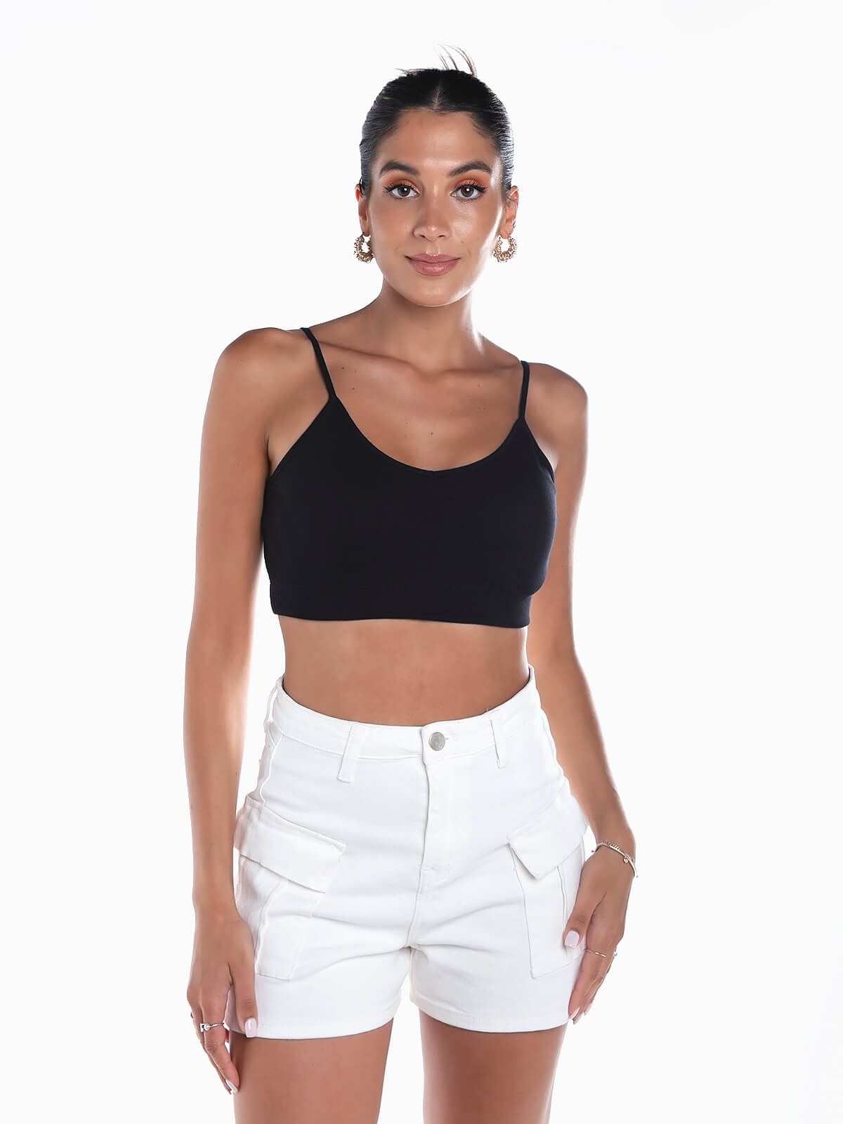 Crop top malha para senhora. Top em tecido 100% algodão de alças finas com decote em V. Elástico na base.