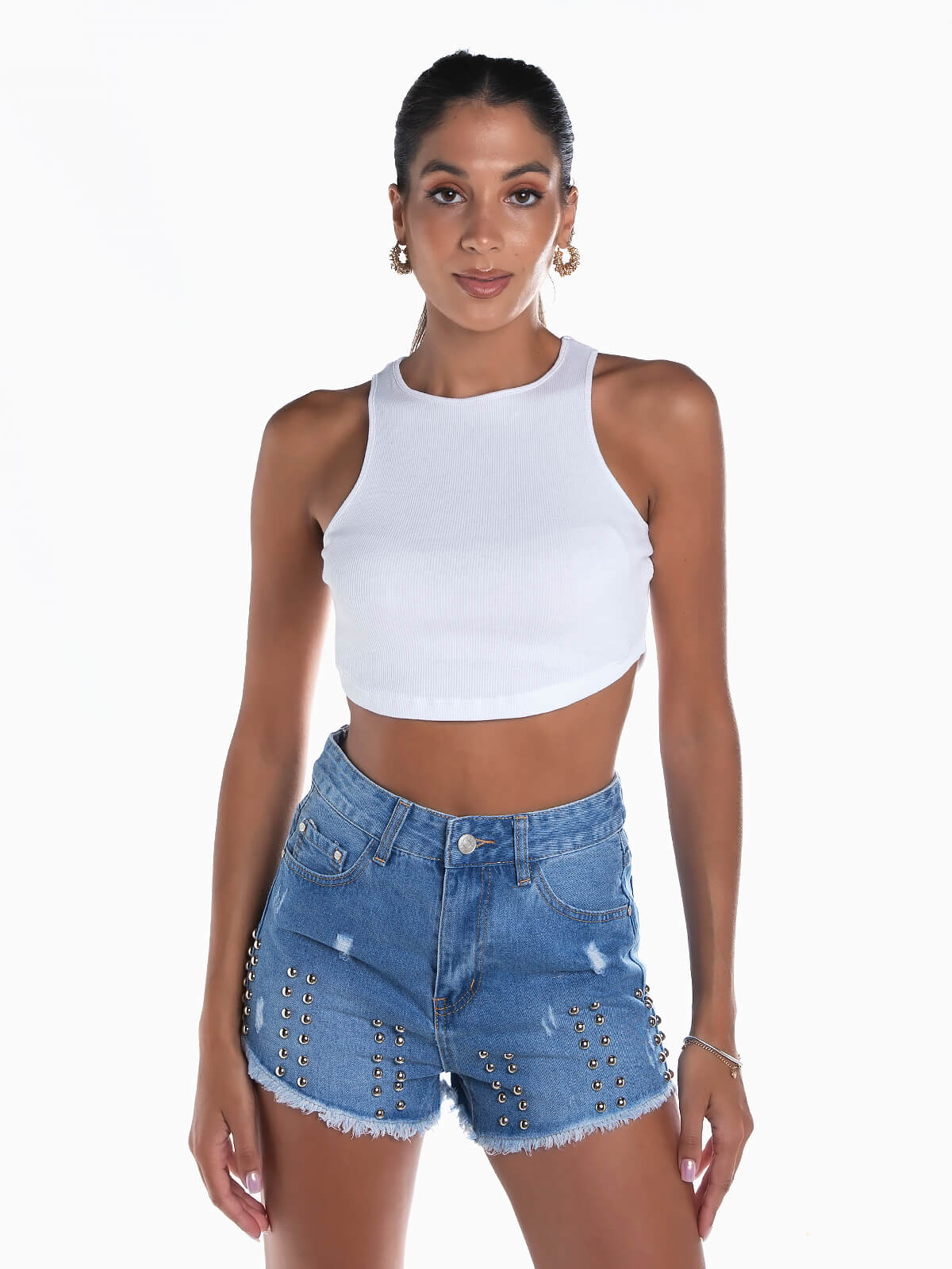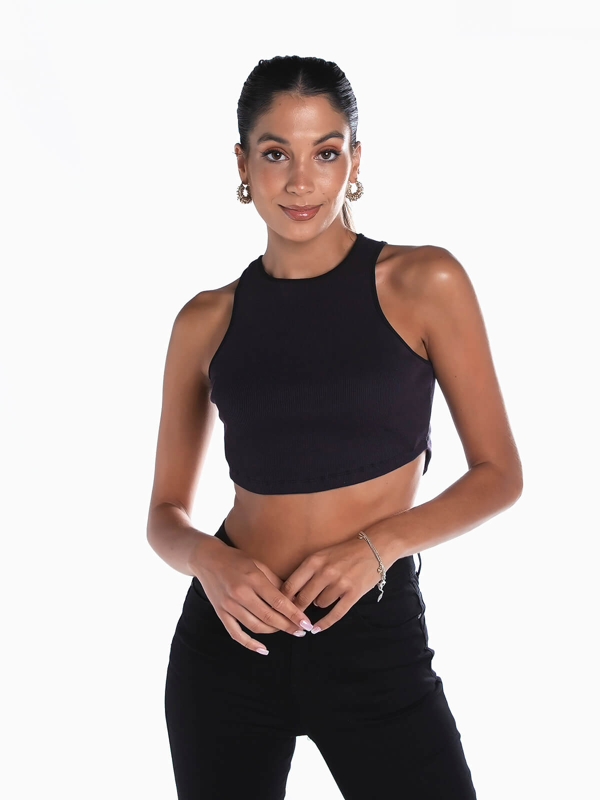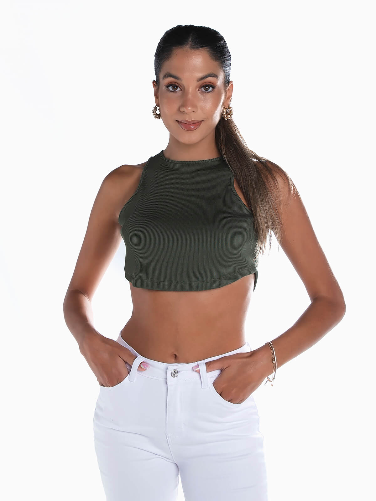 Crop top de manga cava para senhora. Top em malha canelada com decote halter e cós arredondado.
