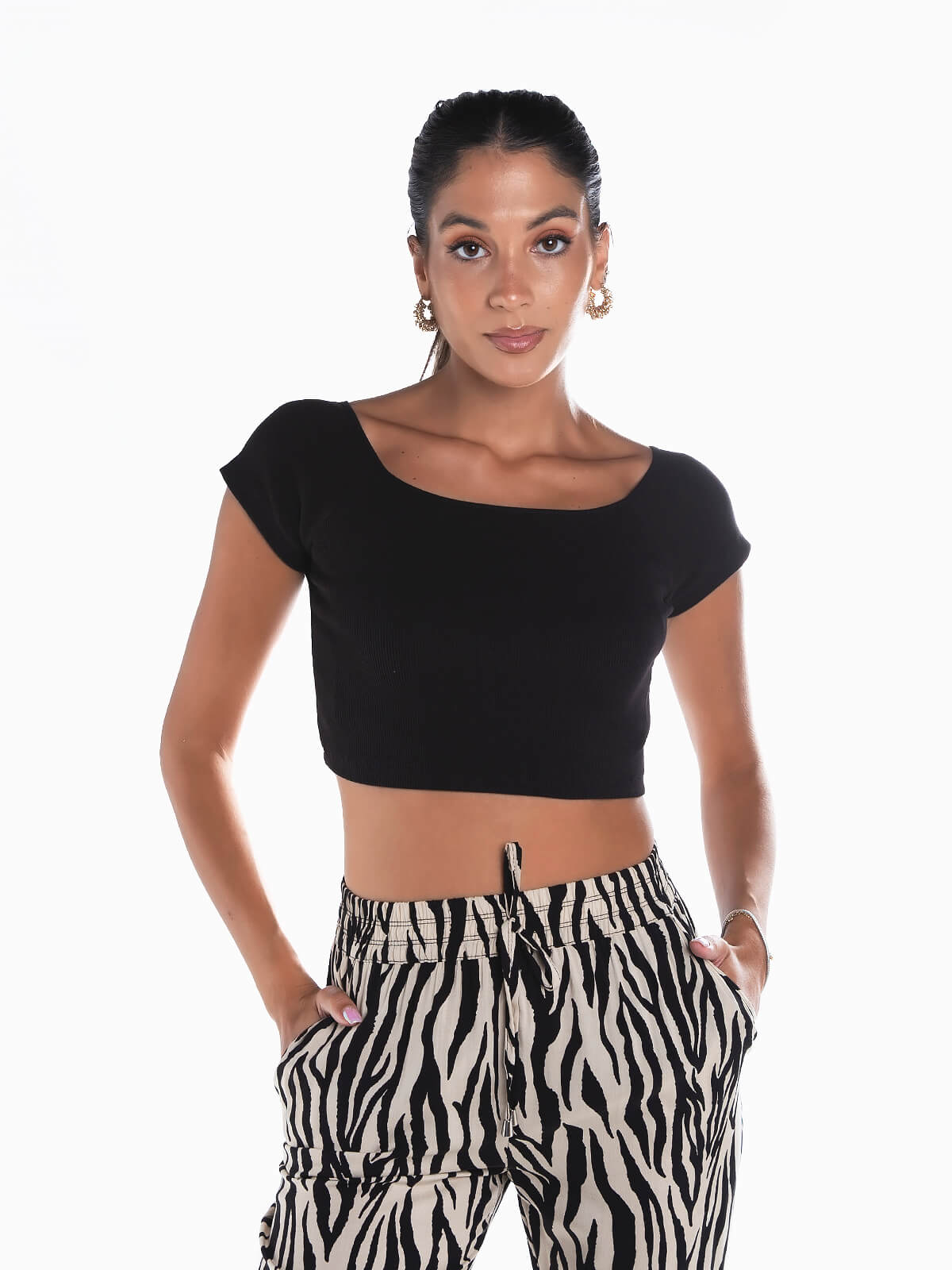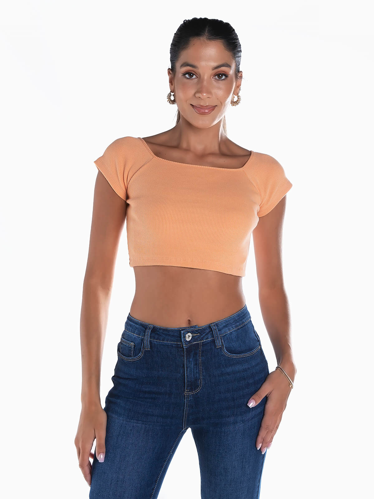 Crop top de manga curta para senhora. Top em malha canelada com decote quadrado.