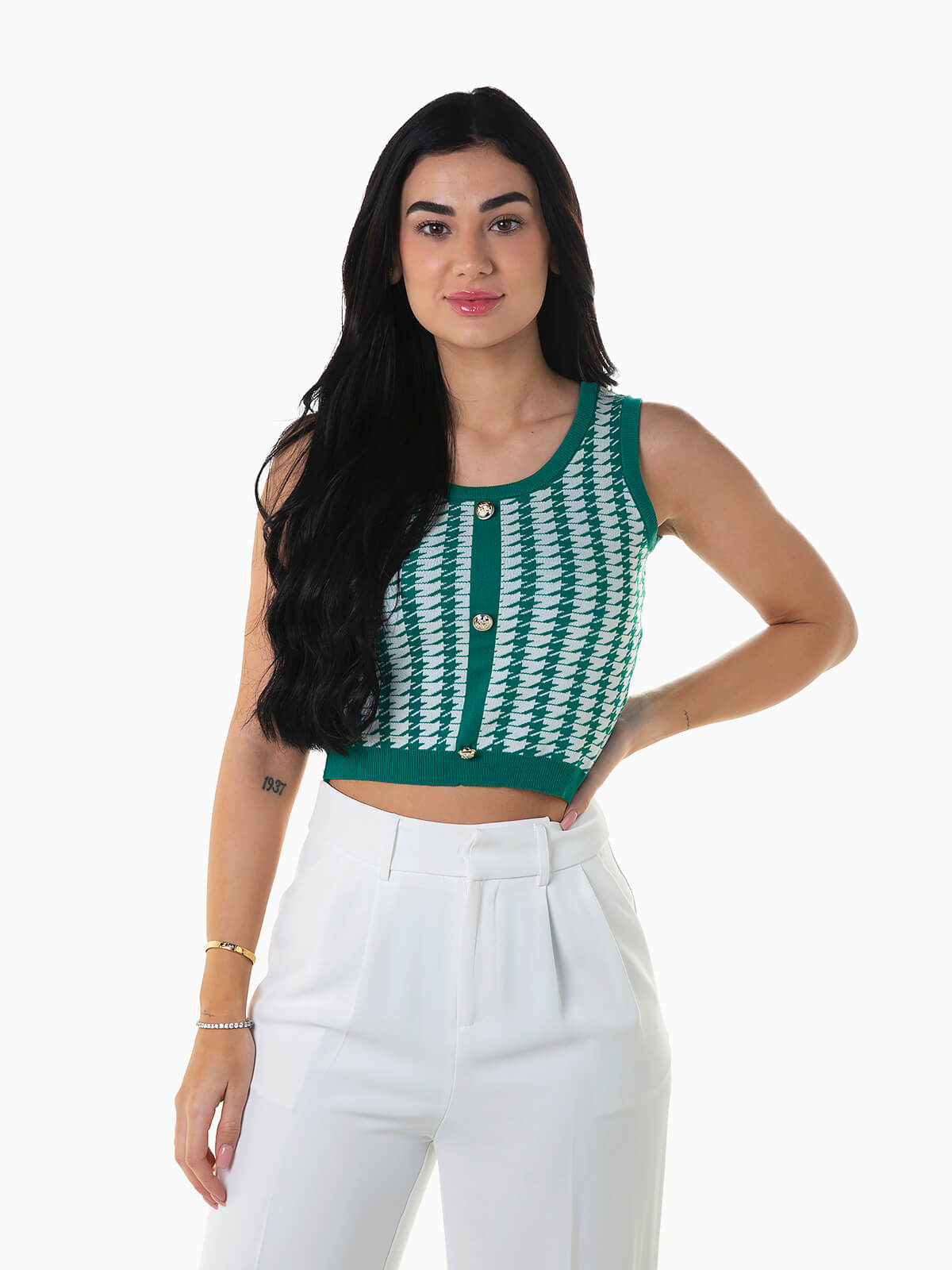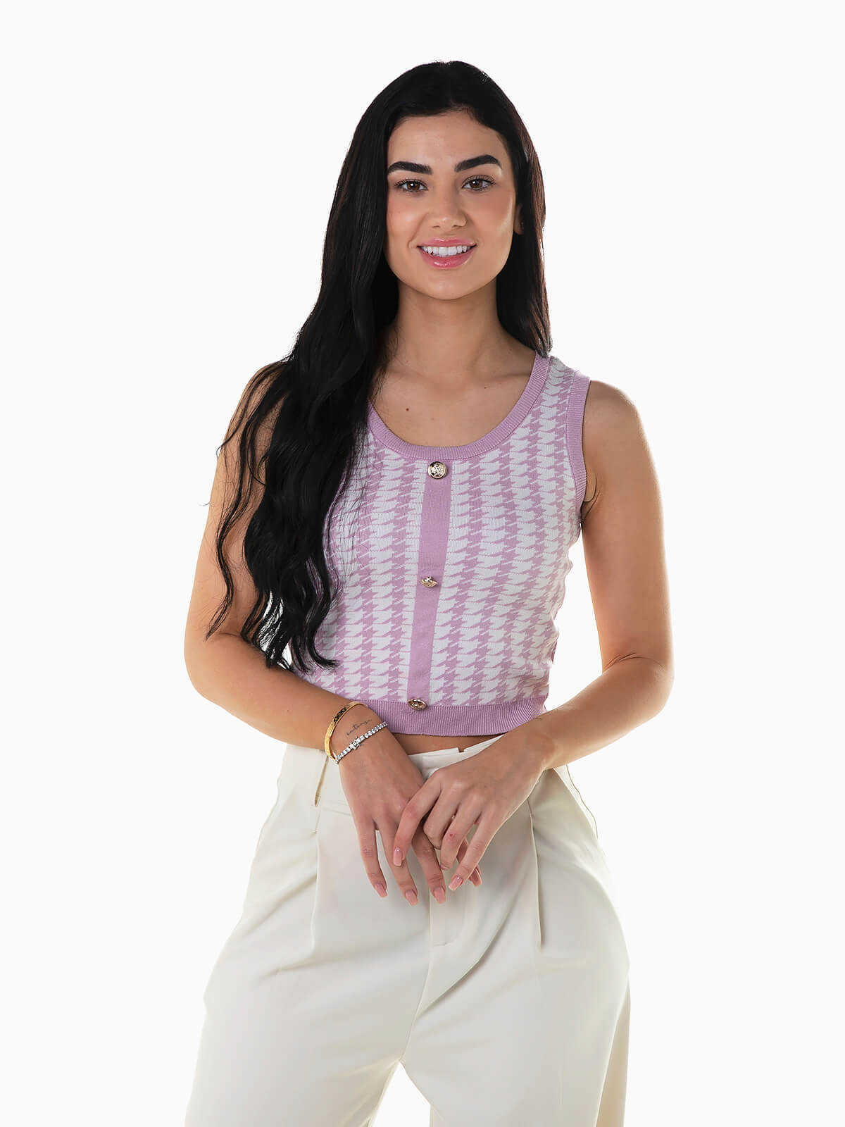 Crop top pied-de-poule para senhora. Top alças de malha com decote redondo e botões dourados aplicados. Acabamentos em nervuras.
