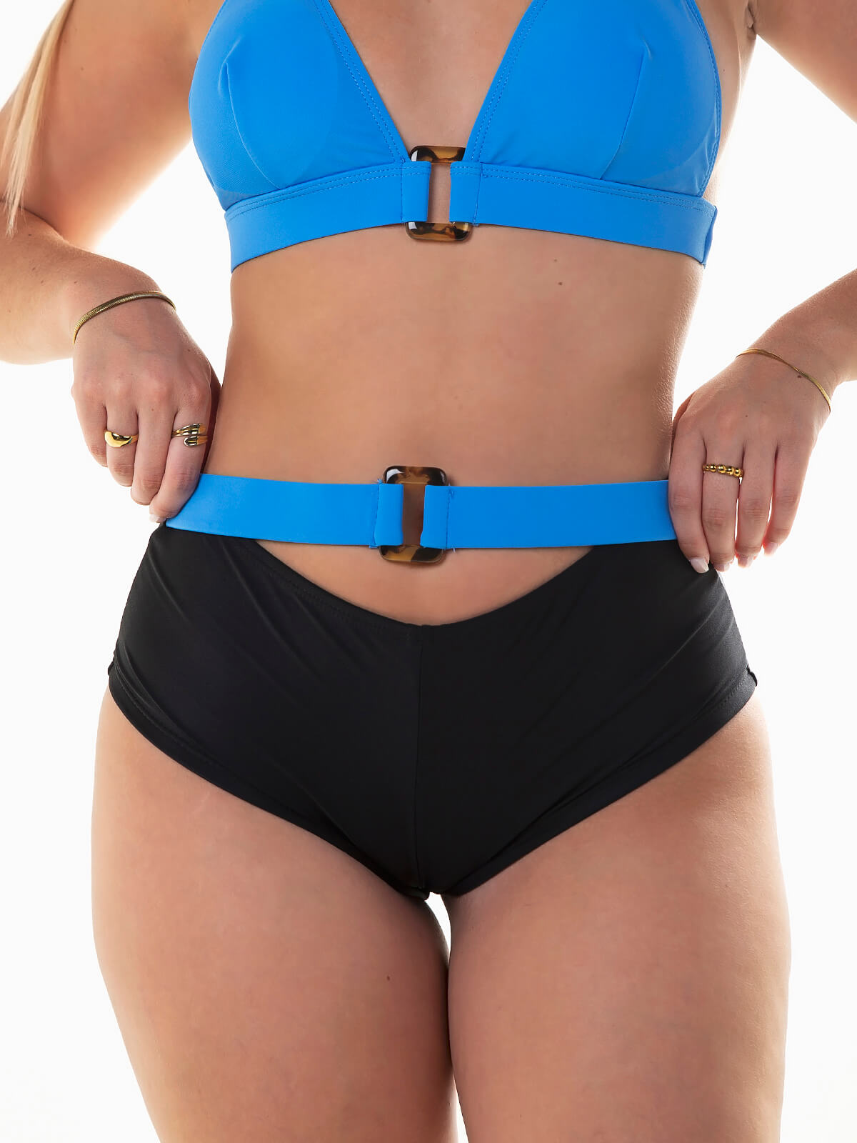 Cueca de biquíni de cintura alta com fivela e acessório decorativo. Cueca elástica modeladora com cobertura parcial.
