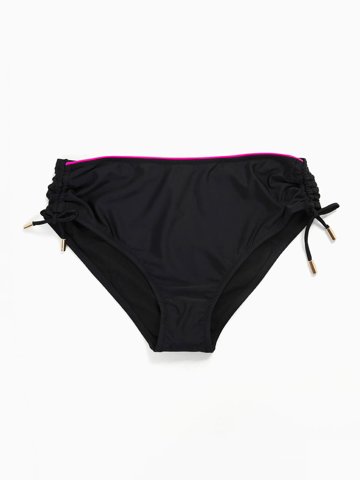 Cueca de biquíni de cintura alta com cobertura parcial para senhora. Cueca elástica com franzidos nas laterias e cordão para ajustar. Pormenor de vivo na cintura.