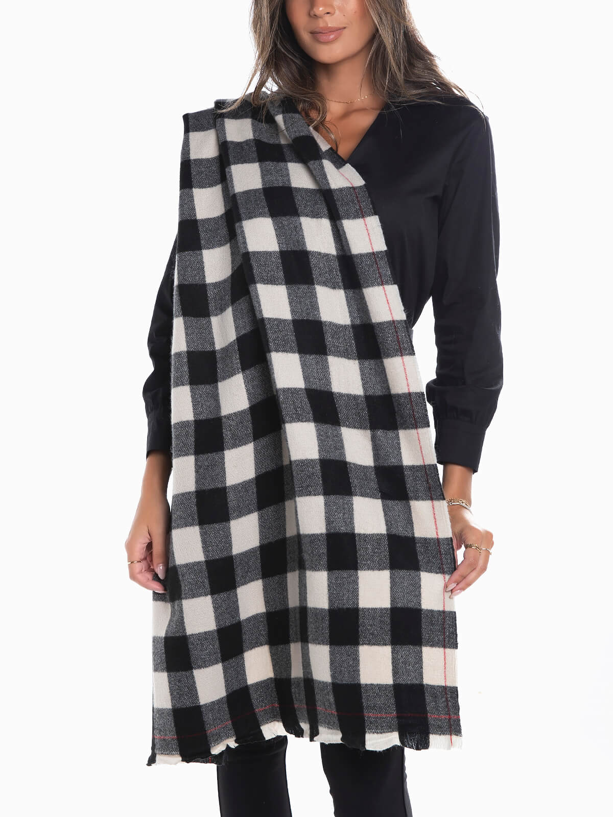 Echarpe aos quadrados pretos e bege para senhora. Echarpe em tecido com mistura de lã. Extremidades desfiadas.