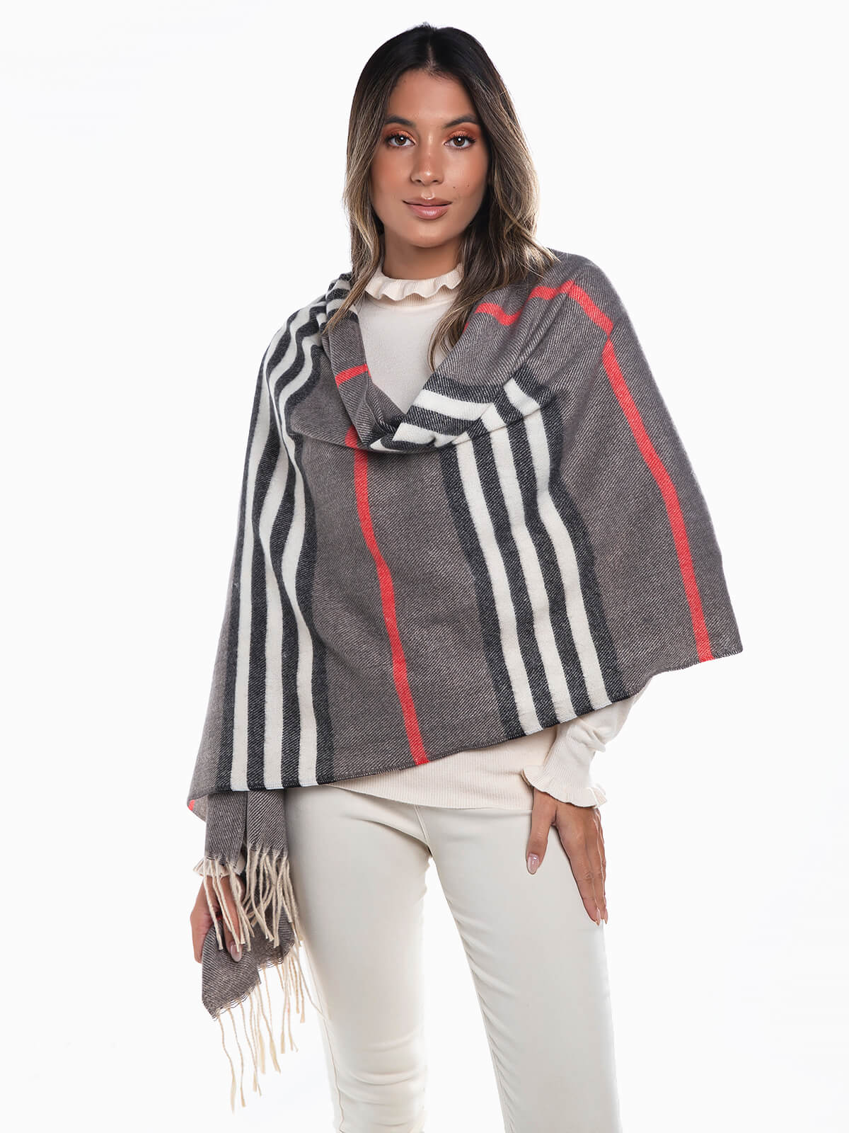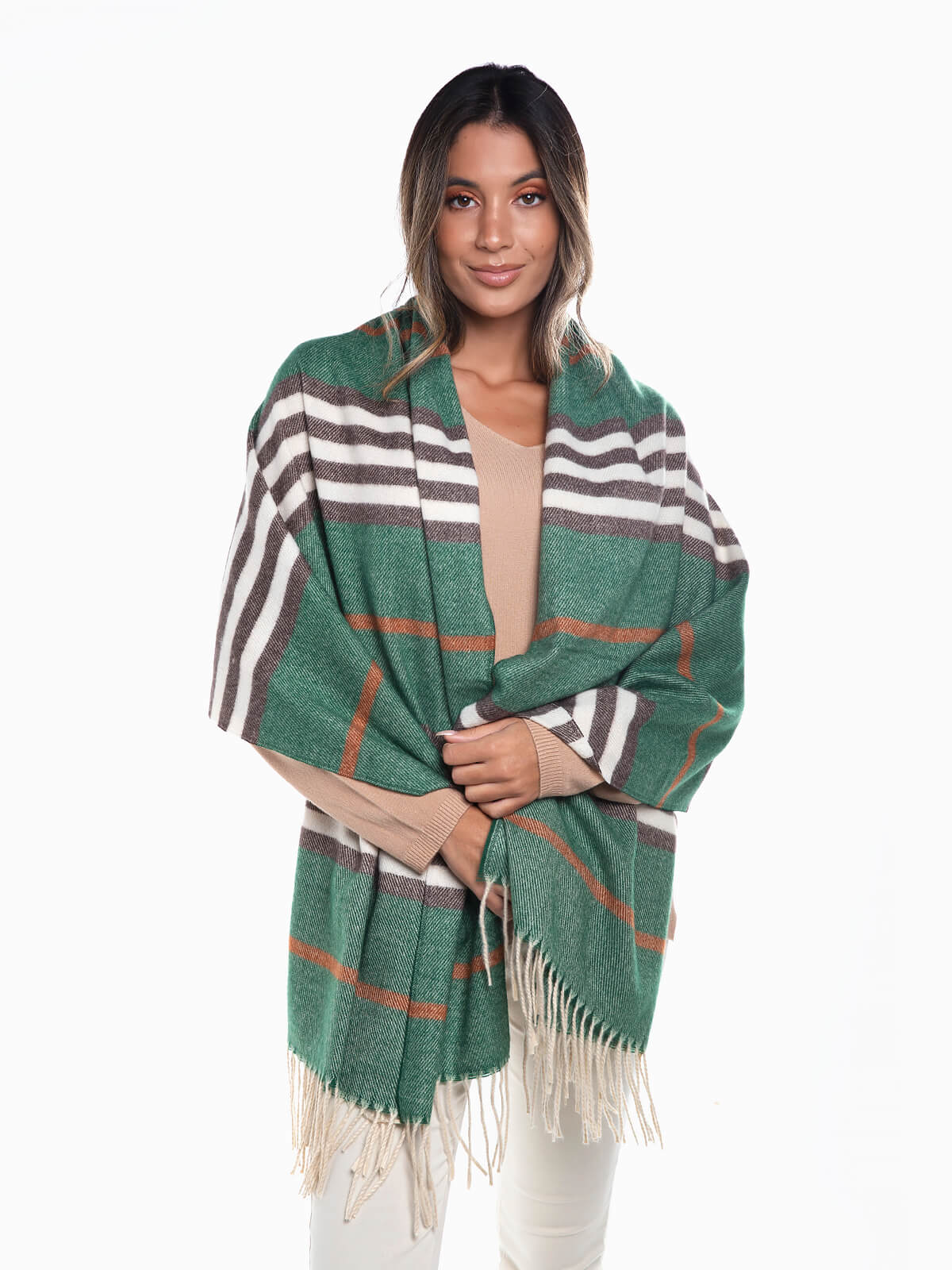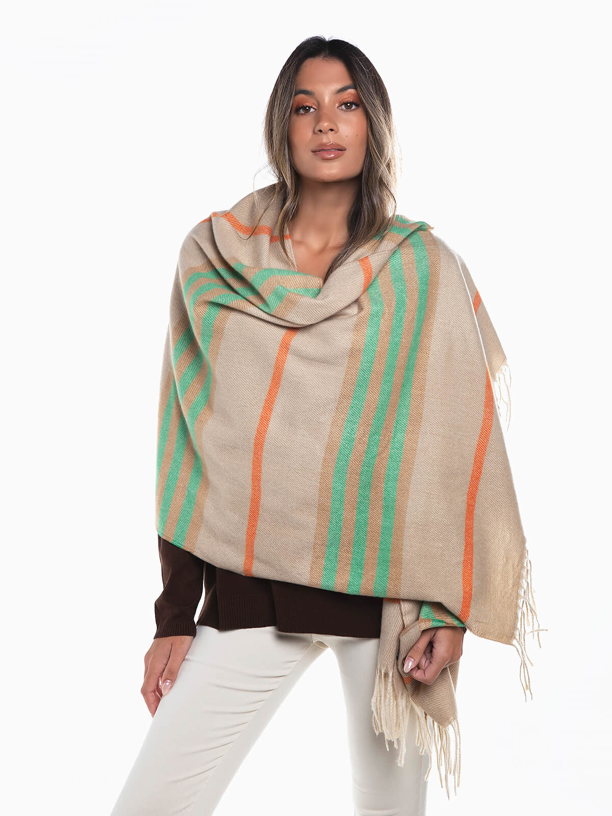 Echarpe com franjas nas extremidades. Echarpe em tecido com mistura de lã. Combinada com riscas e encaixe de cores.