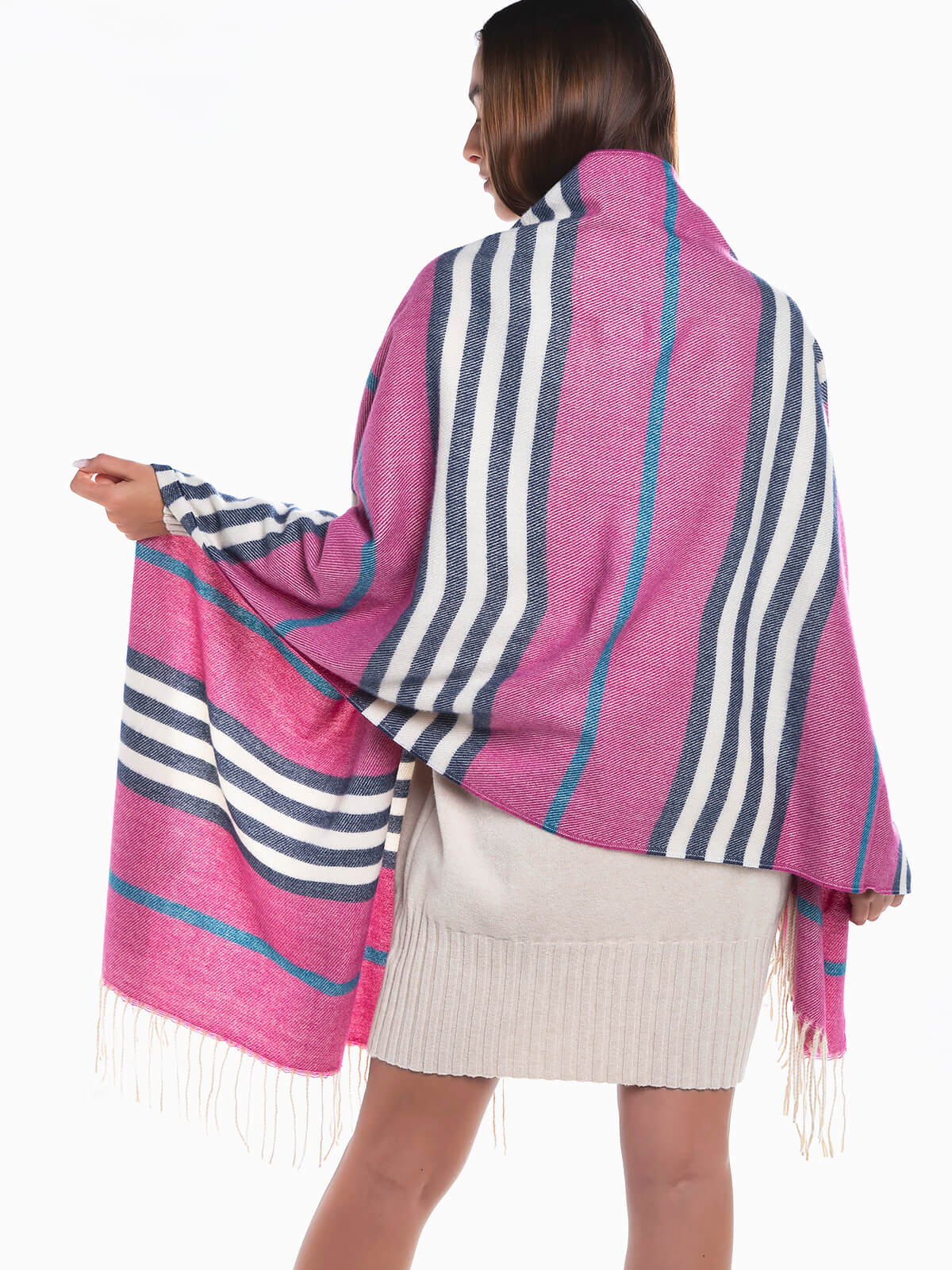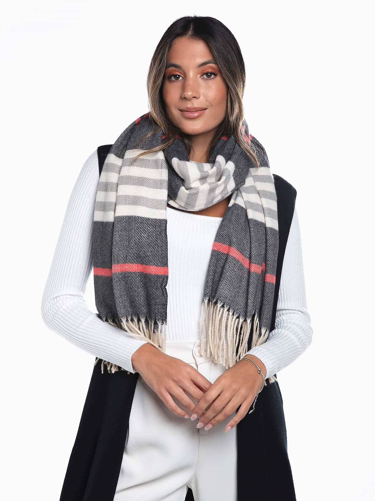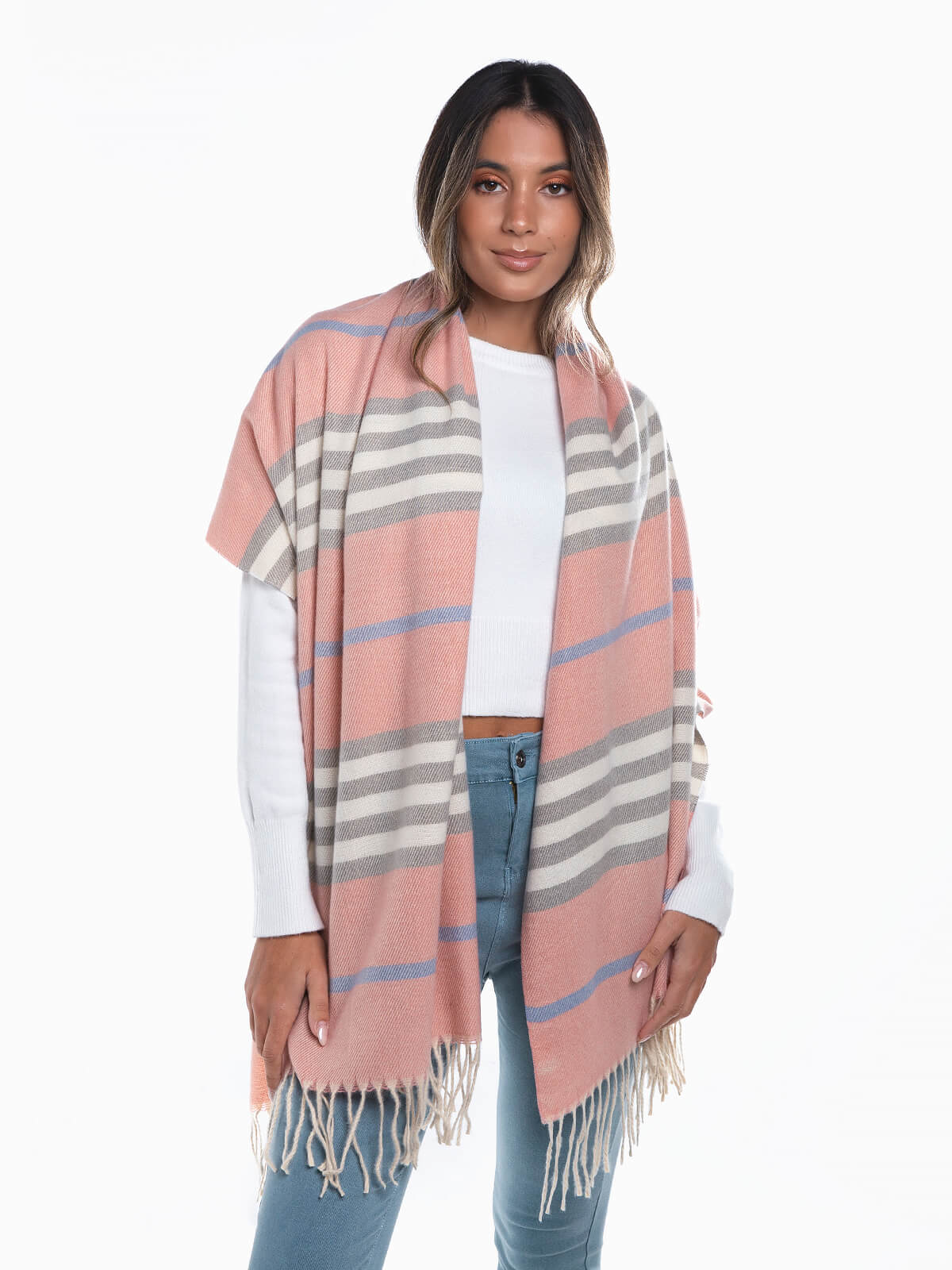 Echarpe com franjas nas extremidades. Echarpe em tecido com mistura de lã. Combinada com riscas e encaixe de cores.