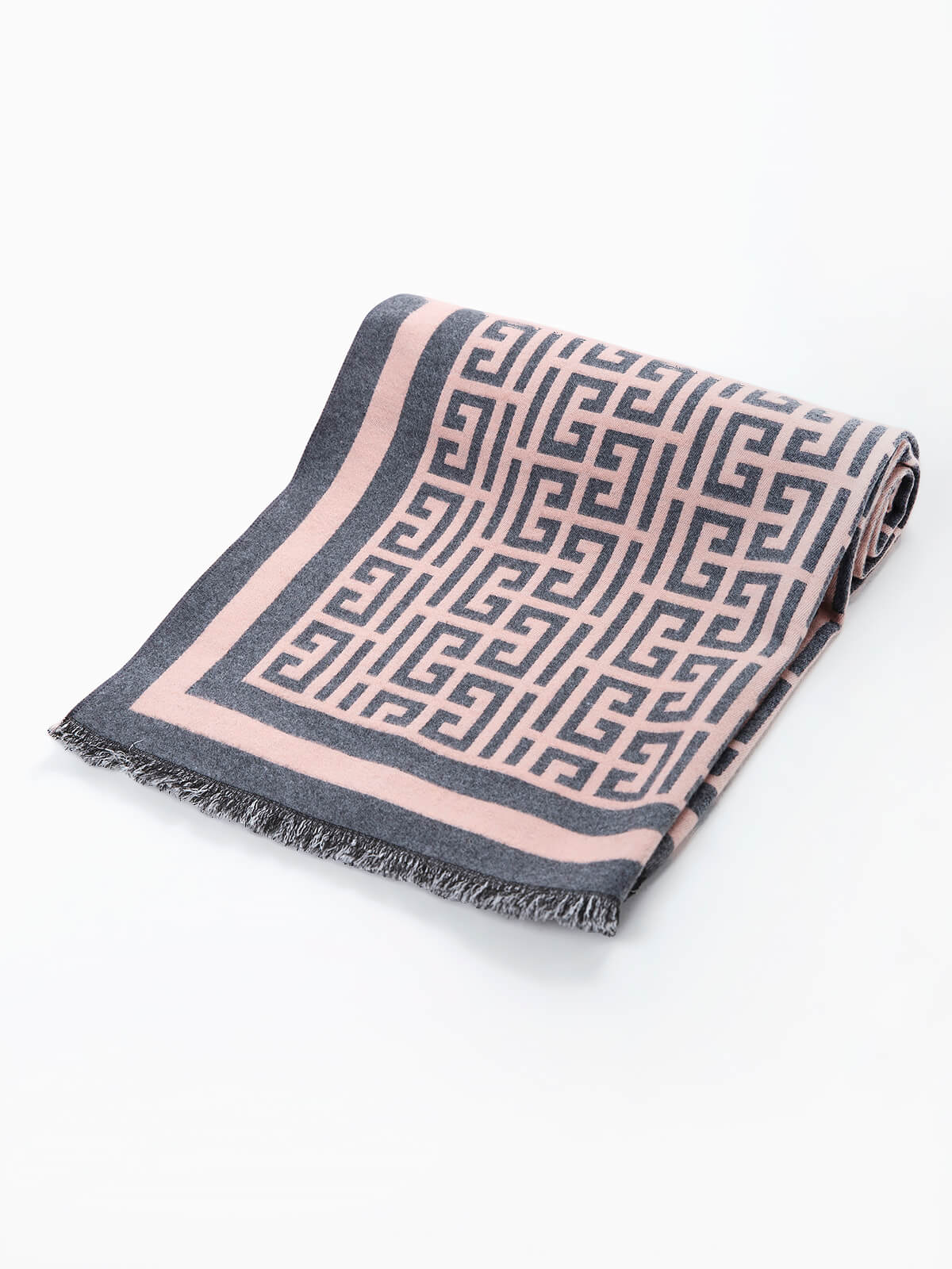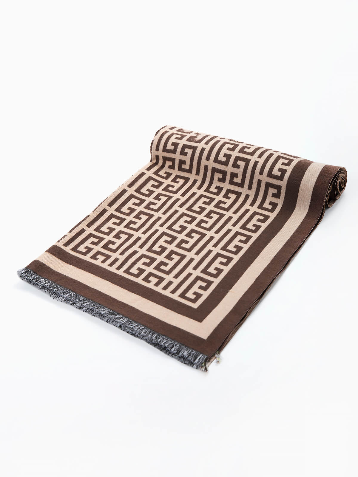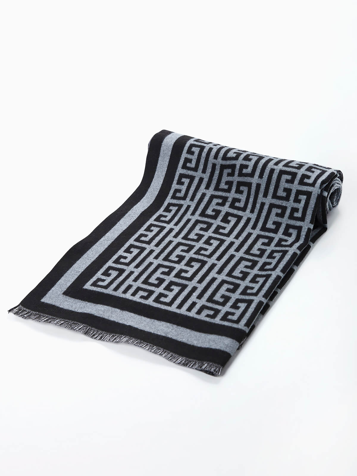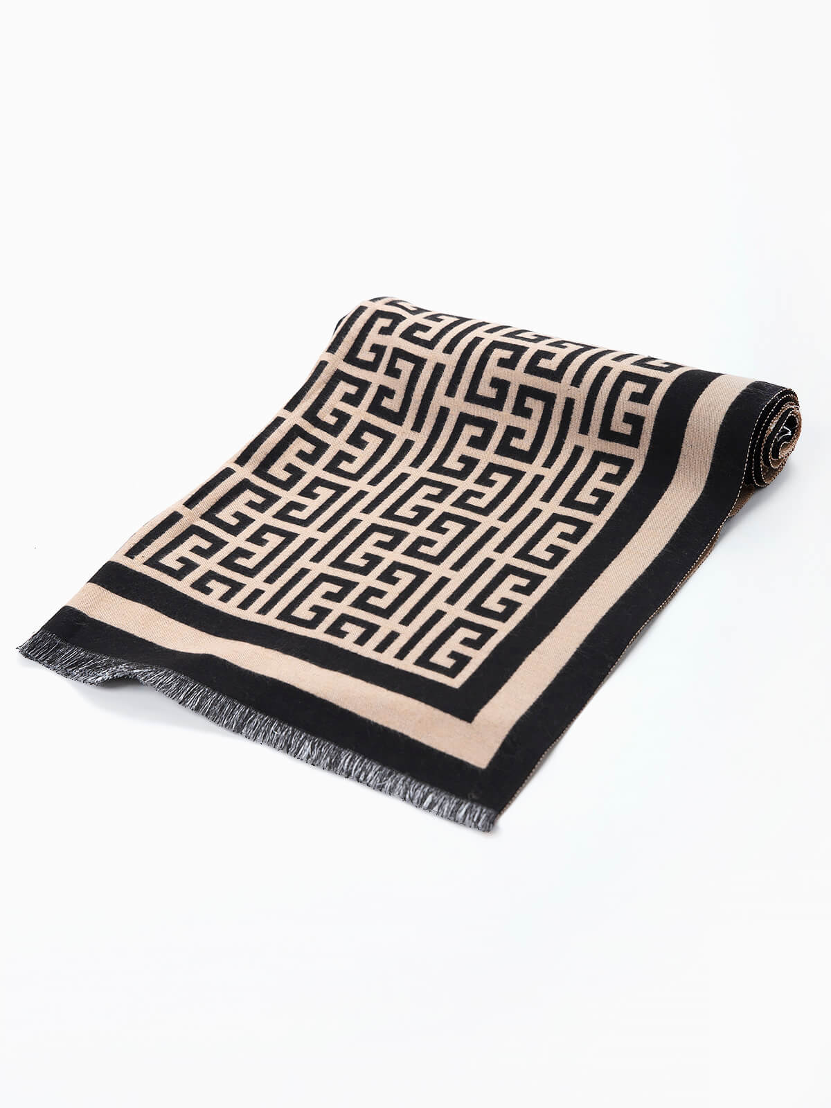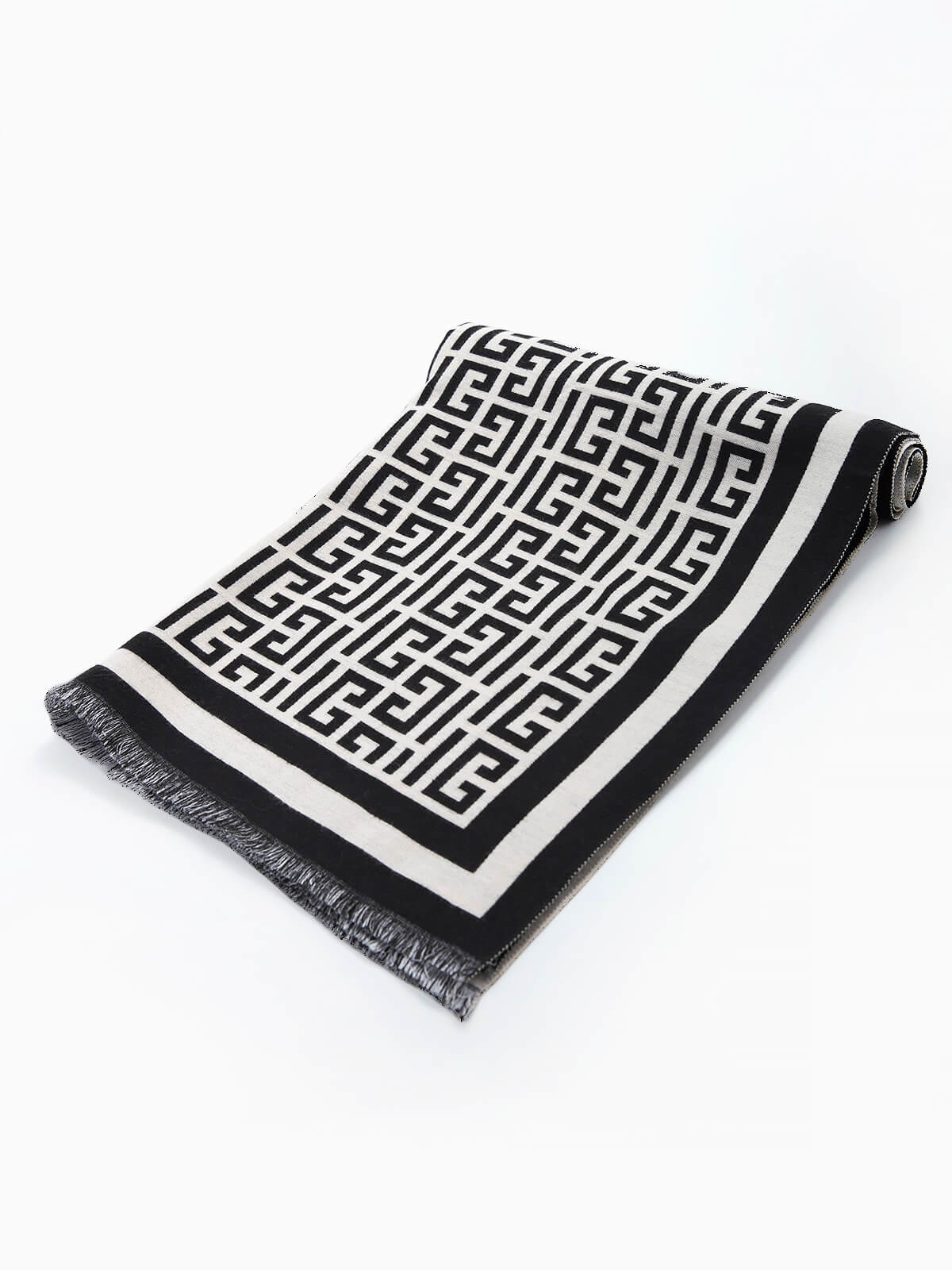 Echarpe larga com estampado geométrico. Echarpe com extremidades desfiadas.