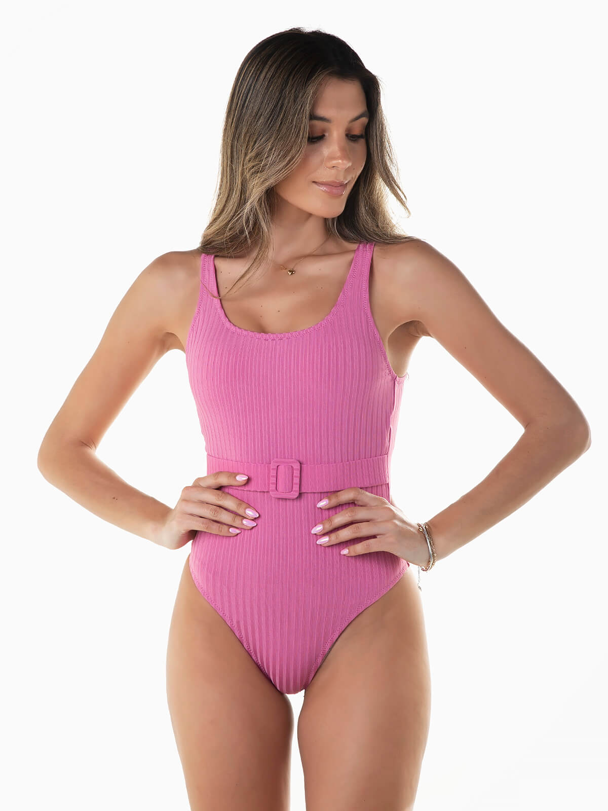 Fato de banho em tecido canelado para senhora. Fato de banho com cinto fixo para definir a cintura. Decote redondo mais profundo na parte posterior. Peito com almofada removível.