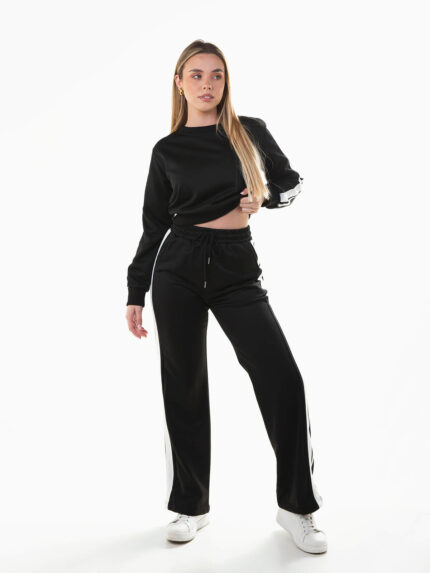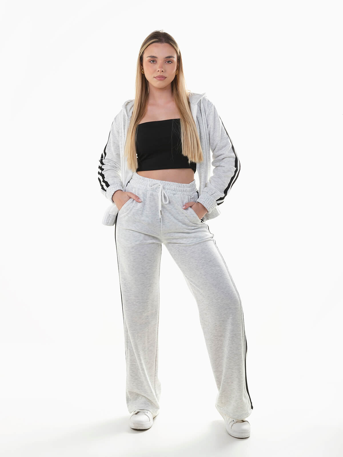 Conjunto desportivo para mulher com bandas laterais em contraste. Casaco manga comprida com capuz e cordão para ajustar. Aperto fecho zíper. Calças largas com cintura alta elástica e cordão para ajustar. 2 bolsos.