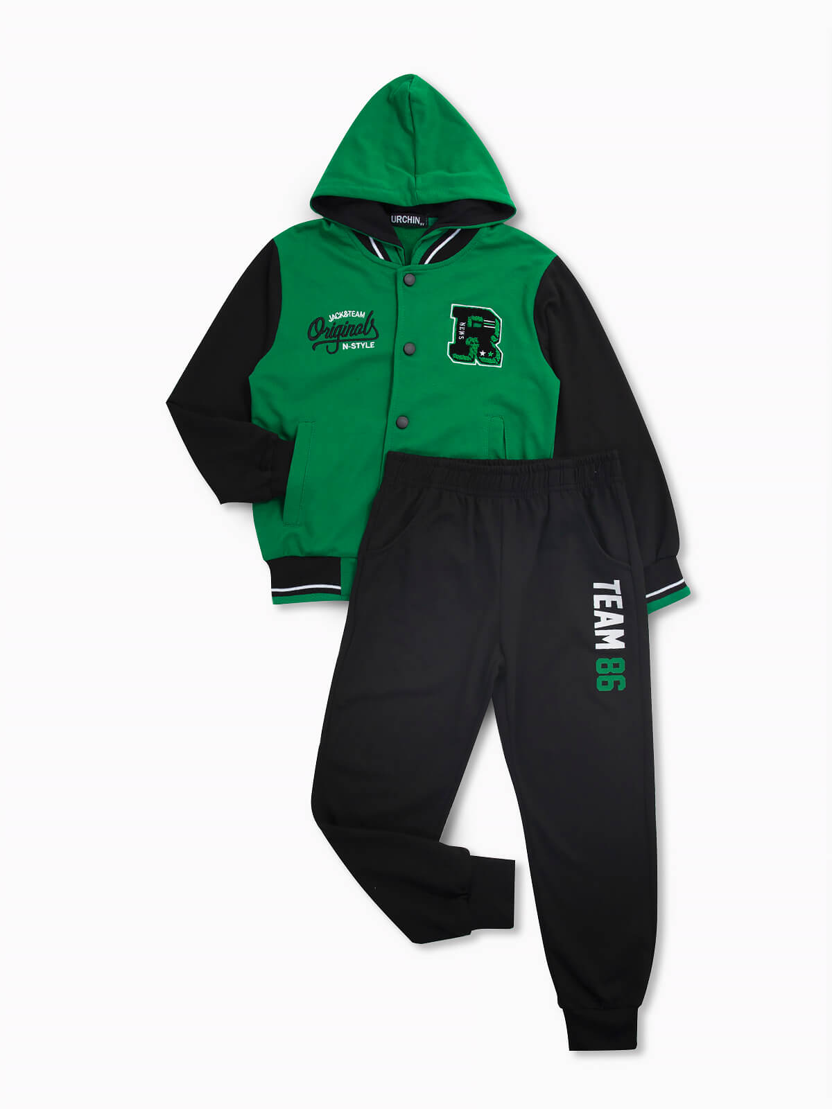 Fato de treino com bordados para menino. Casaco felpa com capuz e manga comprida. 2 bolsos. Aperto de botões de pressão. Calças jogger com cintura elásticas e 2 bolsos.