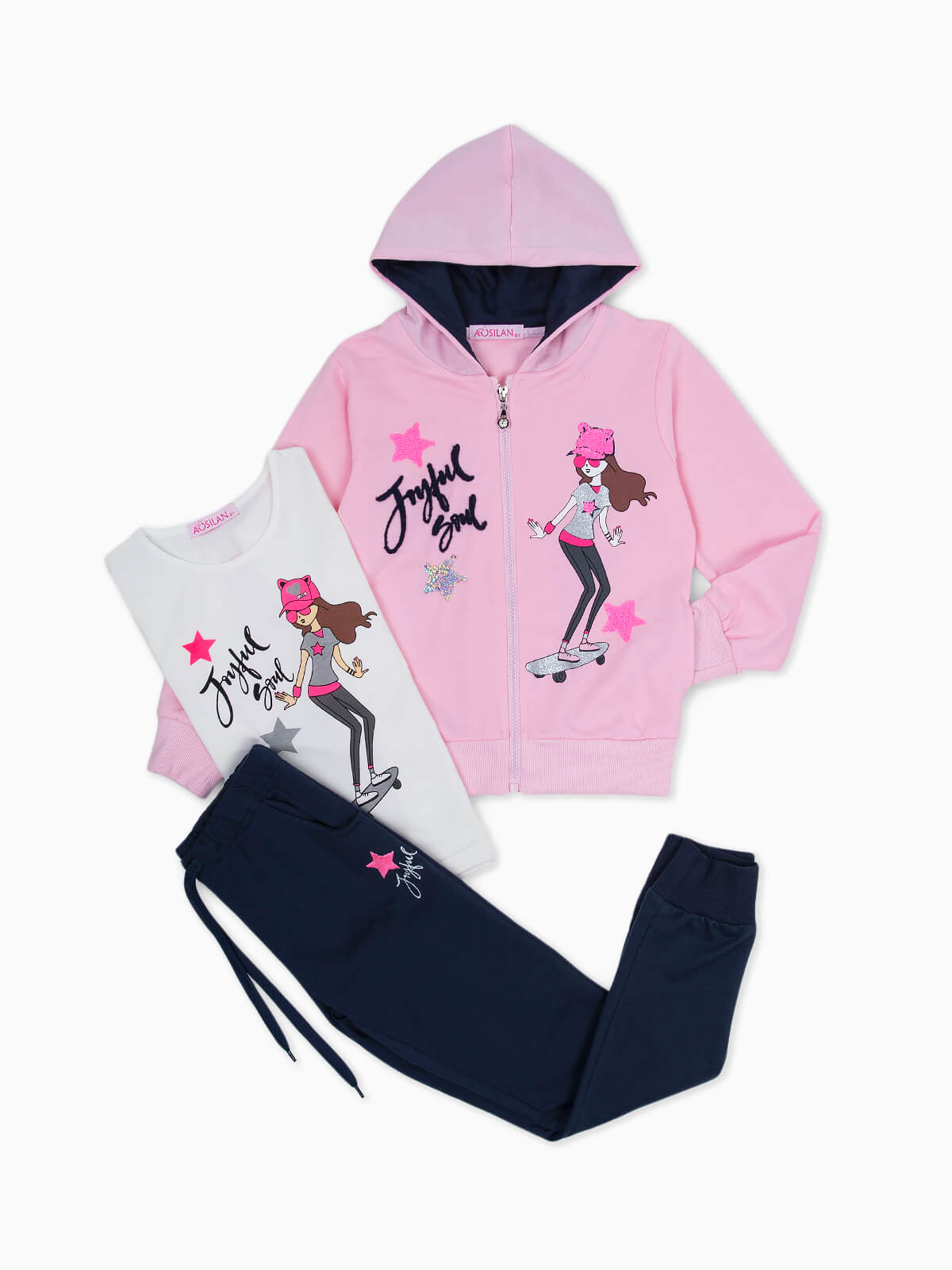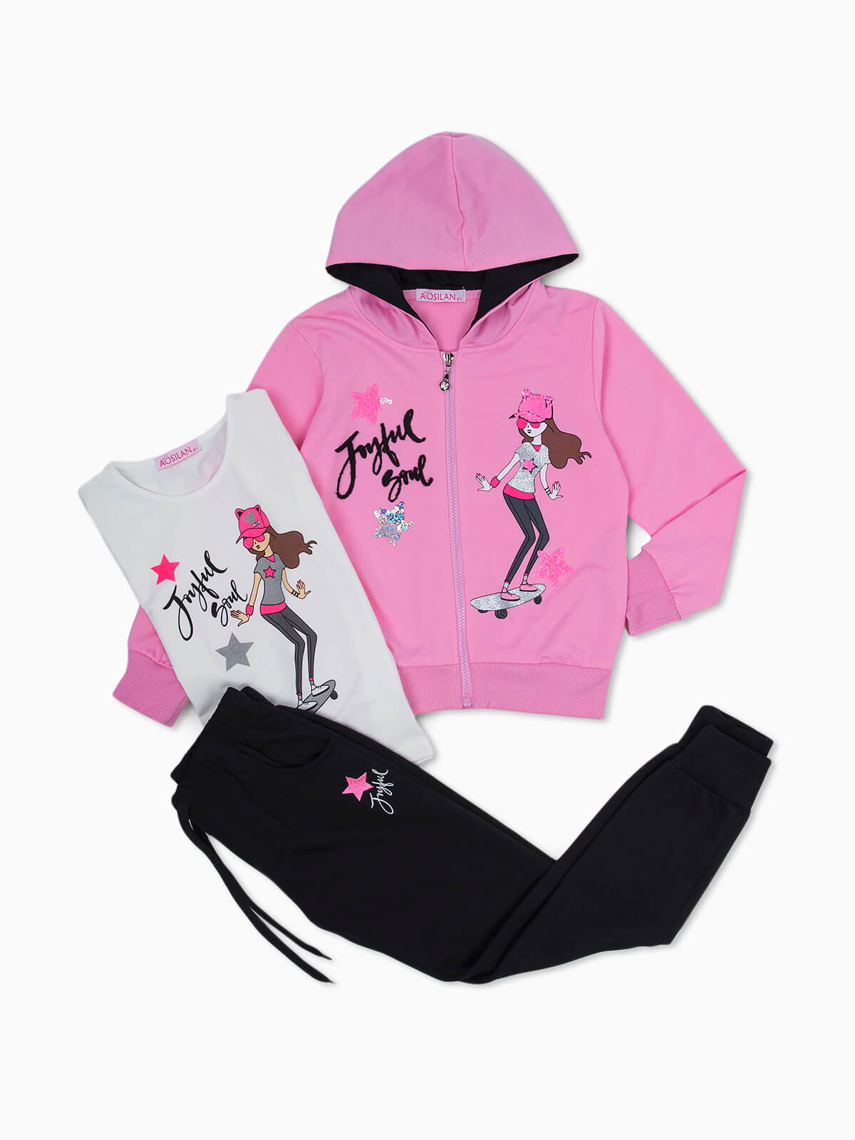 Fato de treino com lantejoulas para menina. Casaco hoodie com extremidades elásticas e dois bolsos. T-shirt manga curta estampada. Decote redondo. Calças jogger com bordado e dois bolsos. Cintura elástica.