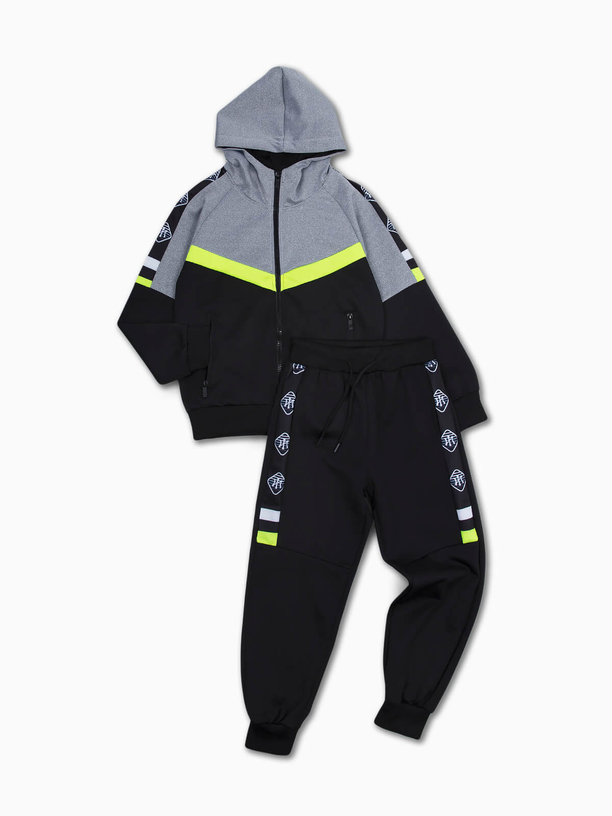 Fato de treino com estampado para menino. Casaco hoodie de manga comprida com punhos e cós elásticos. 2 bolsos. Aperto de fecho zíper. Calças jogger elásticas com cordão para ajustar. Bolsos laterais.
