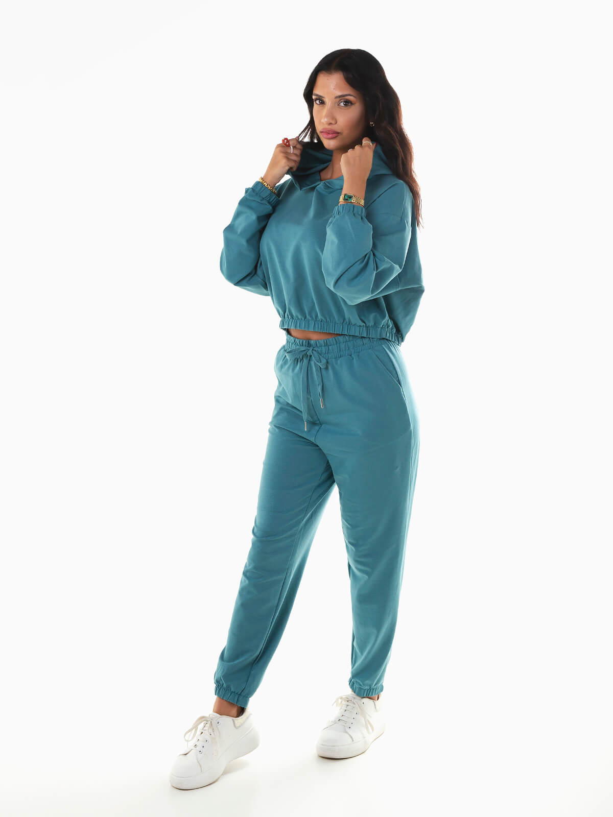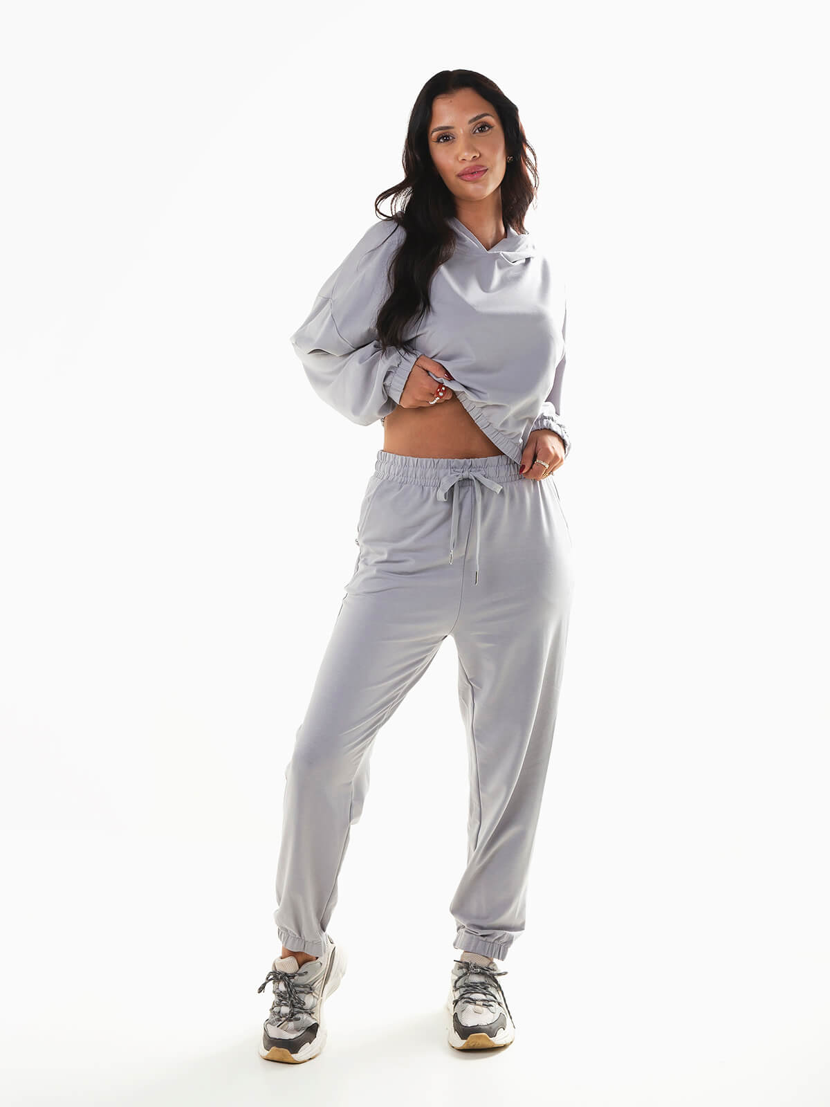 Fato de treino sem carda para mulher com 2 peças. Sweatshirt oversize com capuz e acabamentos elásticos. Manga comprida. Calças jogger de cintura alta com cordão para ajustar. 2 bolsos.