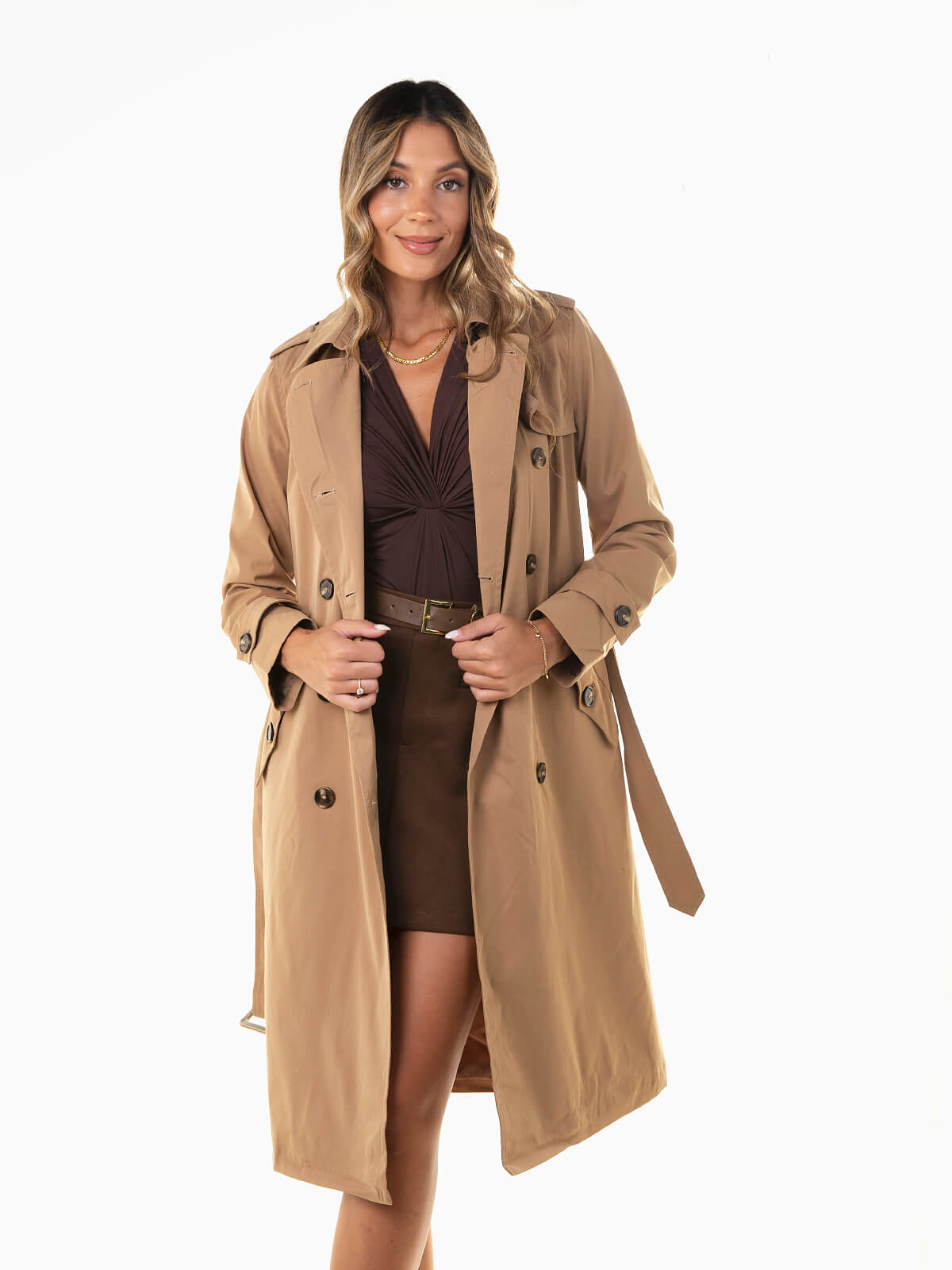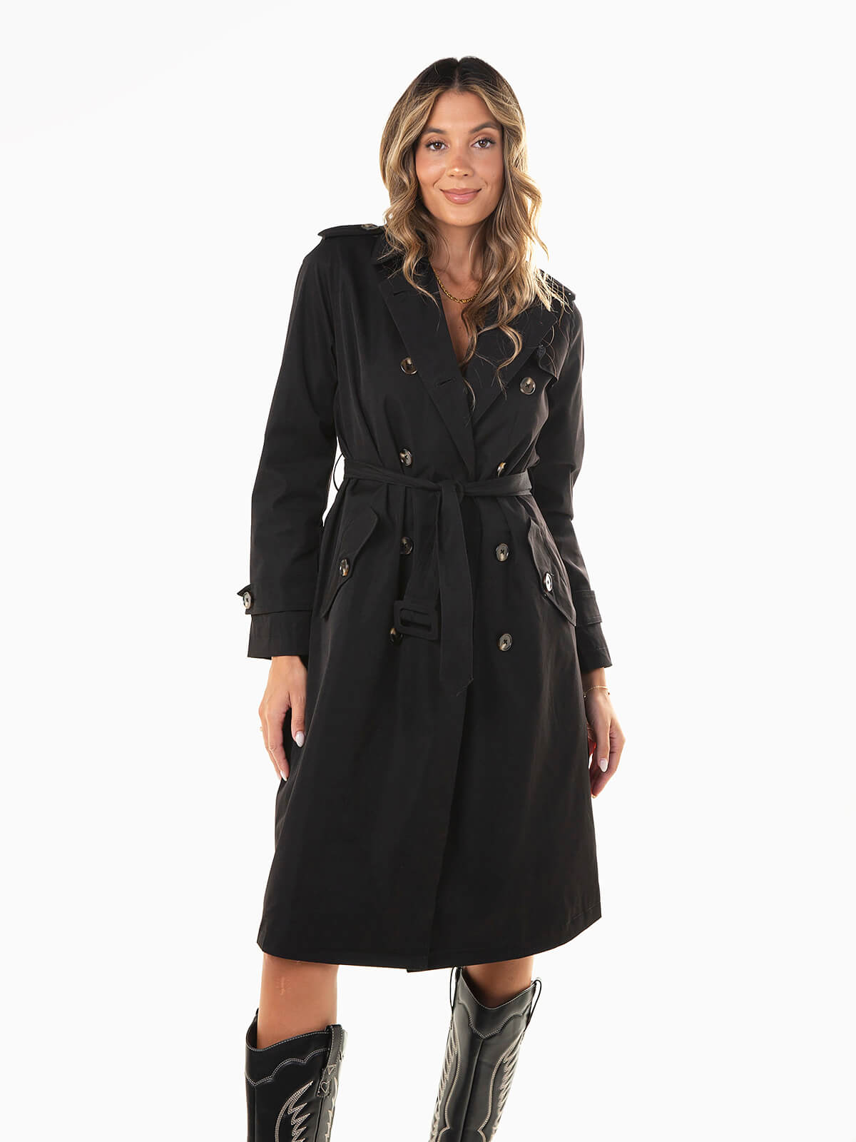 Esta gabardine até ao joelho é perfeita para quem procura um look moderno e elegante. Com cinto removível, fivelas nos punhos e ombros, interior forrado e dois bolsos frontais, combina conforto e sofisticação. O aperto cruzado de botões dá um toque clássico, tornando-a uma peça versátil para qualquer ocasião.