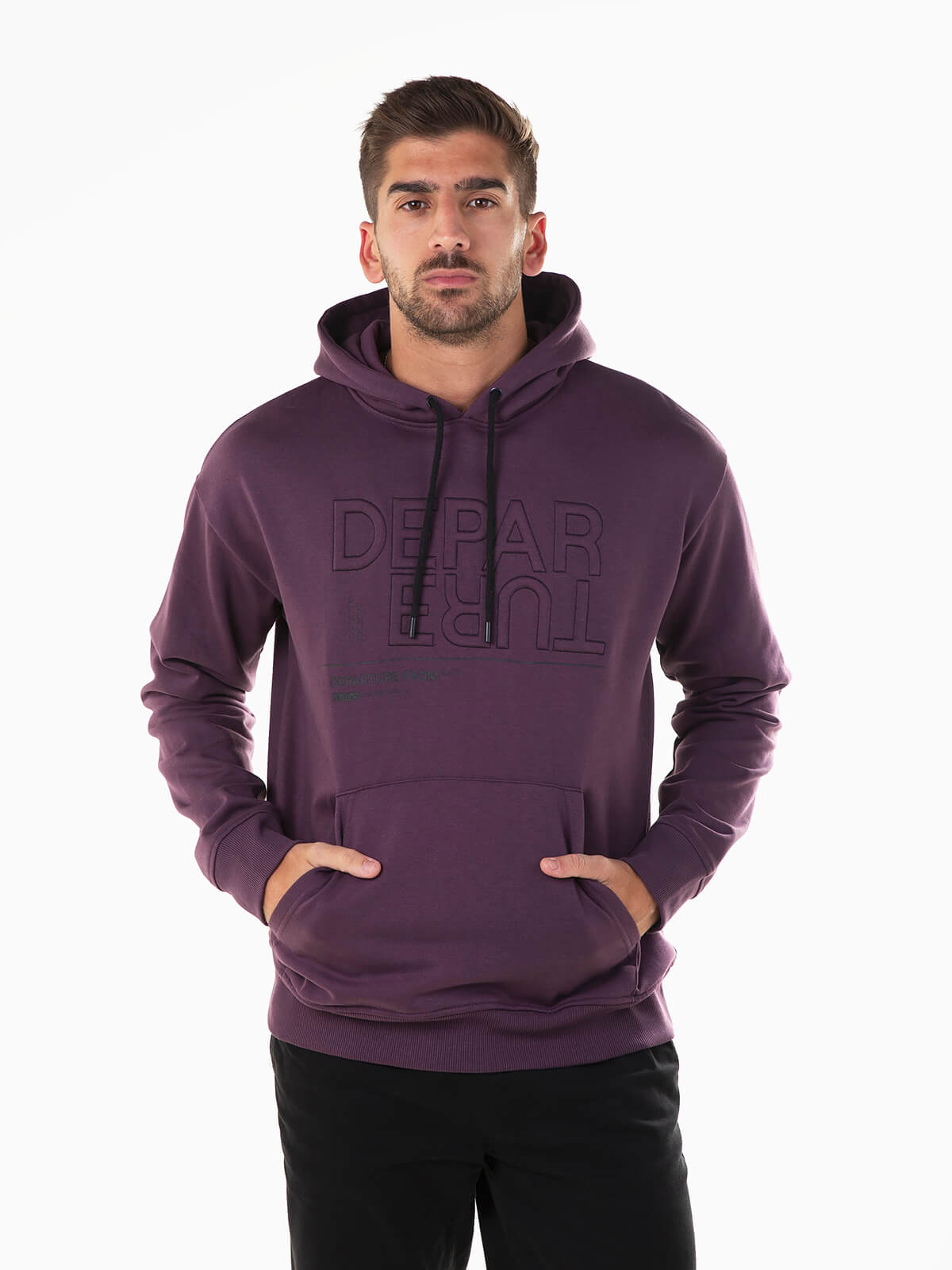 Hoodie com interior cardado e bordados no peito. Sweatshirt com capuz e cordão para ajustar. Manga comprida. Bolso canguru. Acabamentos canelados.
