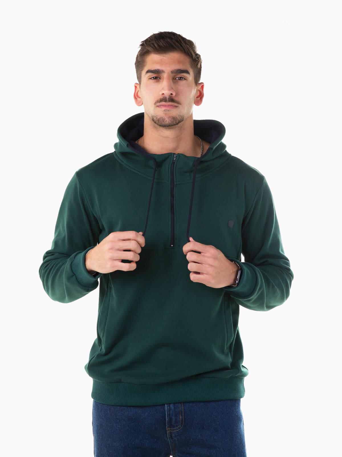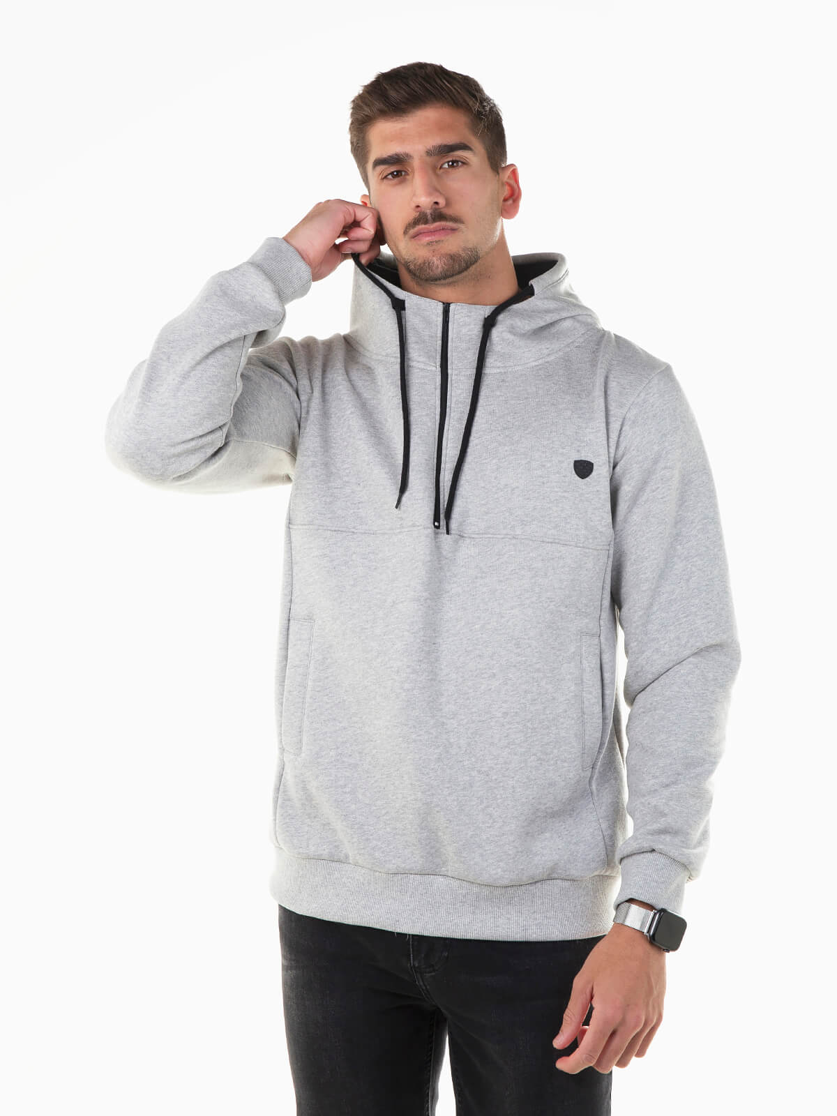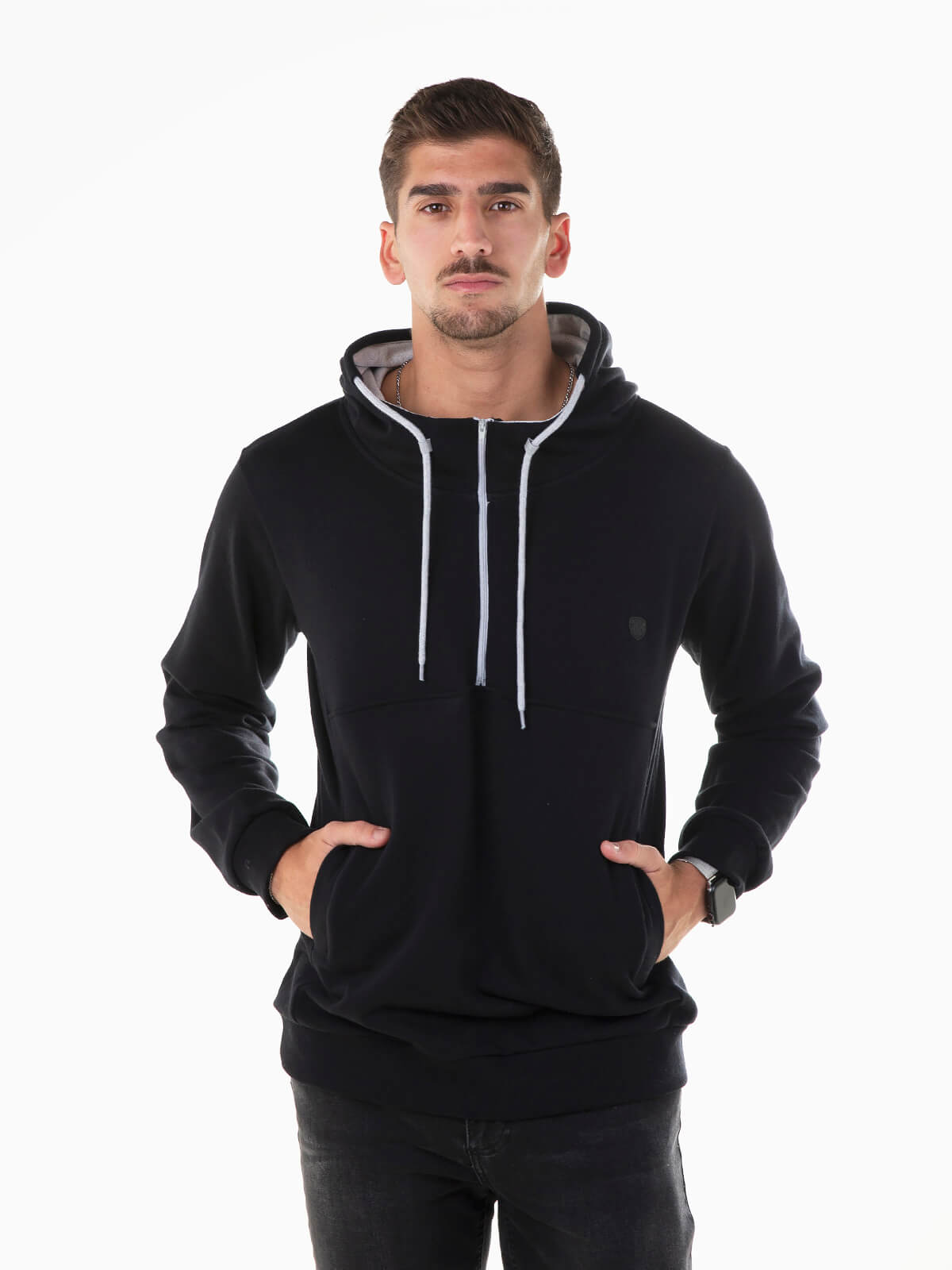 Hoodie felpa de algodão com símbolo no peito. Sweatshirt com capuz e cordão para ajustar. Interior cardado. Bolso canguru. Gola subida com aperto fecho zíper.