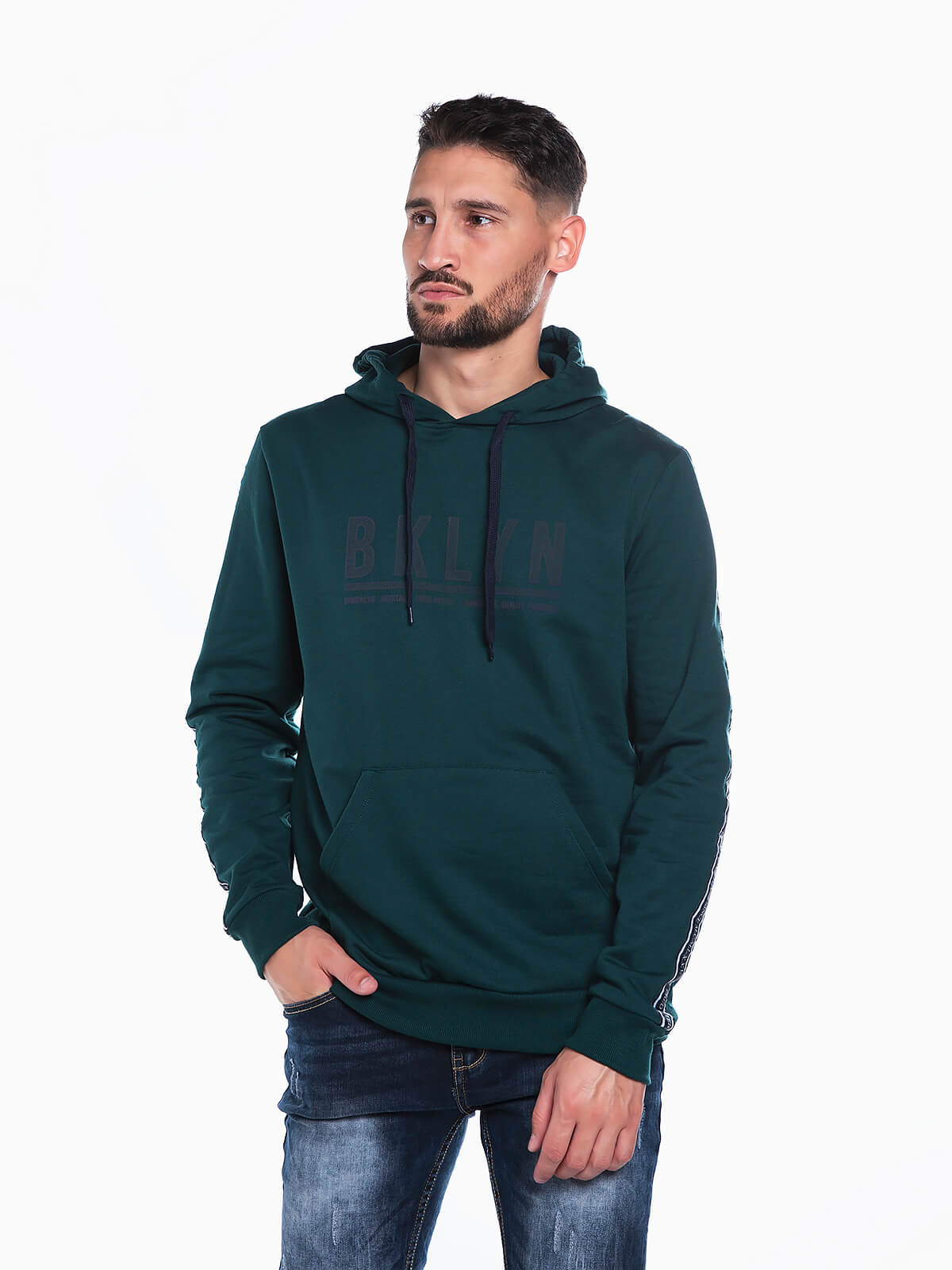 Hoodie homem com risca estampada na manga. Camisola com capuz estampada BKLYN no peito. Punhos elásticos. Bolso canguru.
