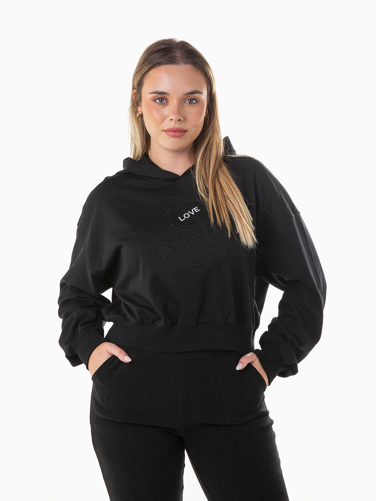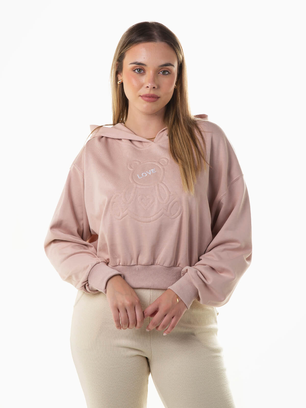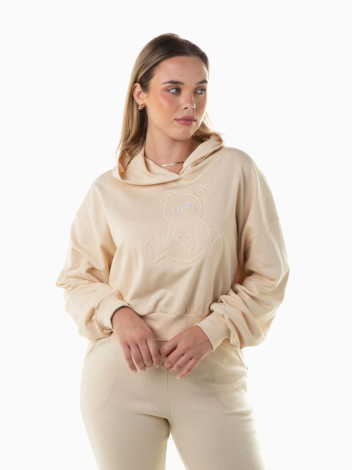 Hoodie oversize curta com urso saliente à frente. Sweatshirt felpa com capuz sem carda. Manga comprida. Acabamentos elásticos.