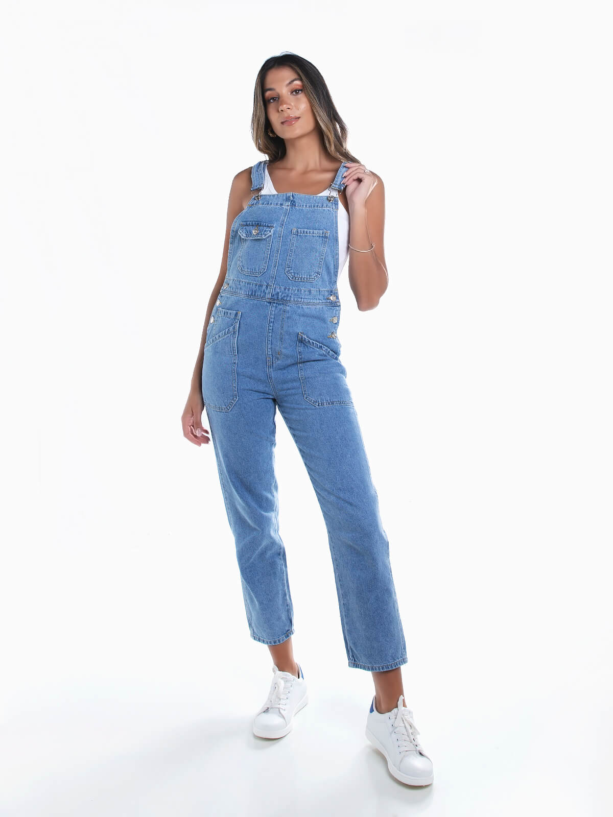 Jardineiras de ganga compridas para senhora. Jardineiras com alças ajustáveis e dois bolsos no peito. Aperto lateral de botões. 5 bolsos. Lavagem azul claro.