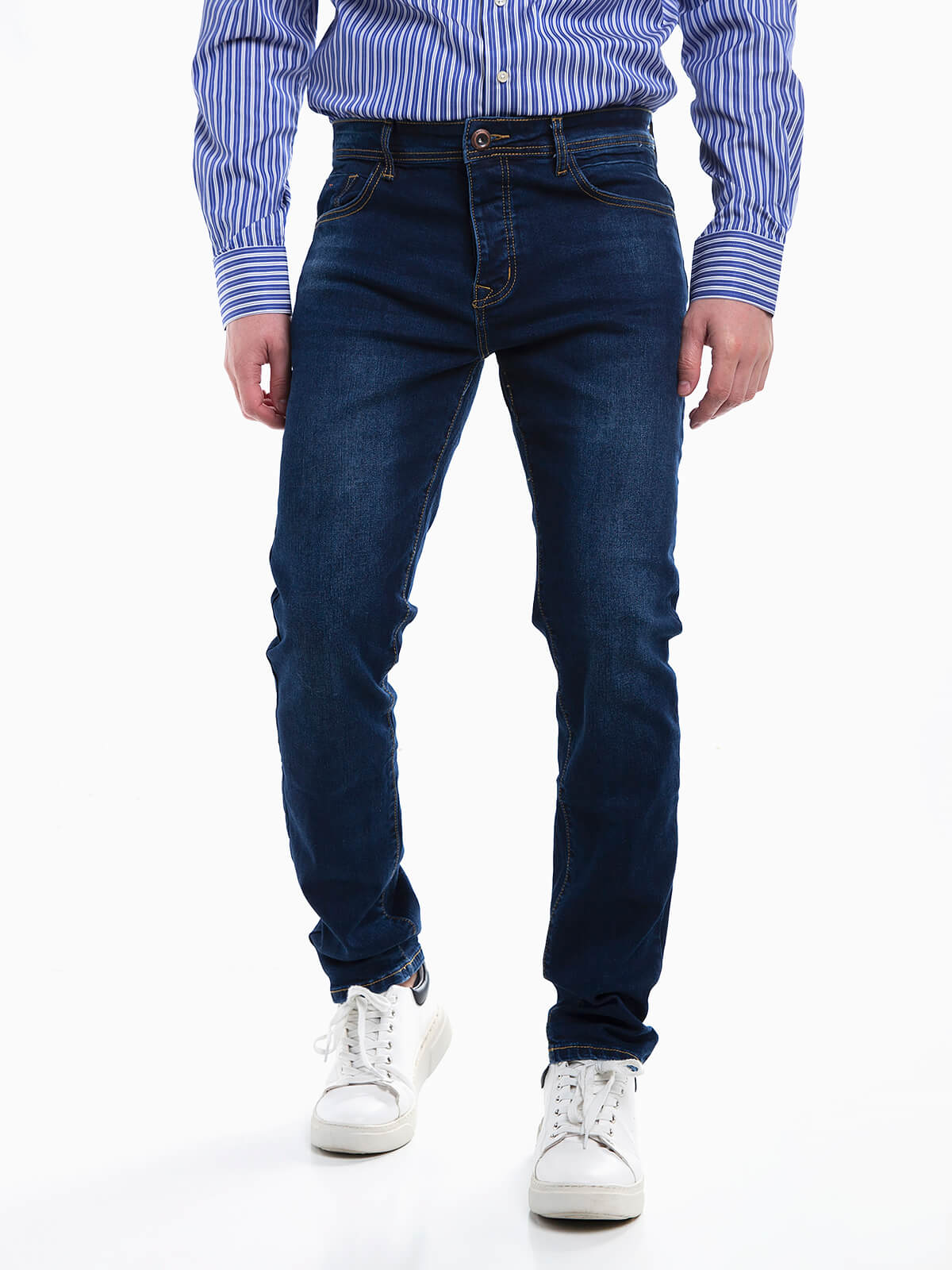Jeans lavagem azul escuro regular fit para homem. Calças ganga elásticas com 5 bolsos. Aperto frontal botões.