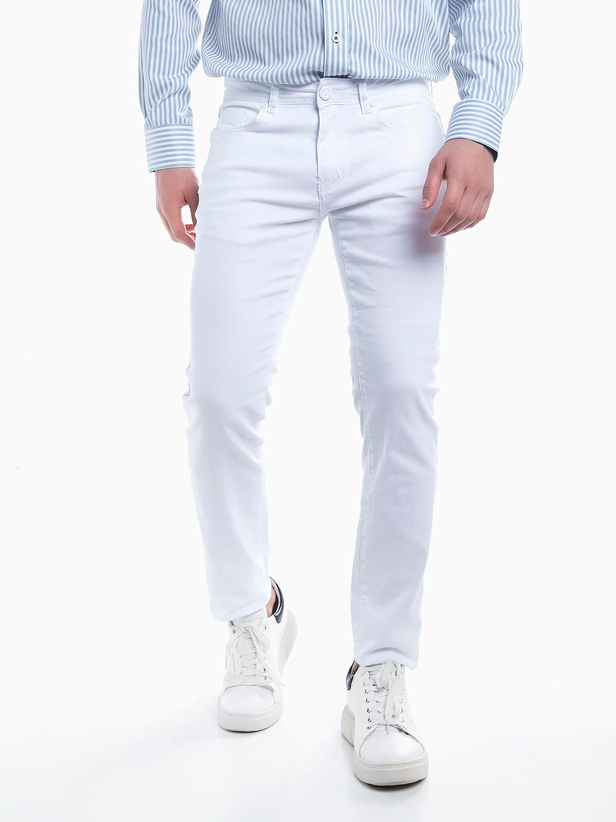 Jeans brancas slim fit para homem. Calças ganga elásticas com 5 bolsos. Aperto de fecho éclair e botão.