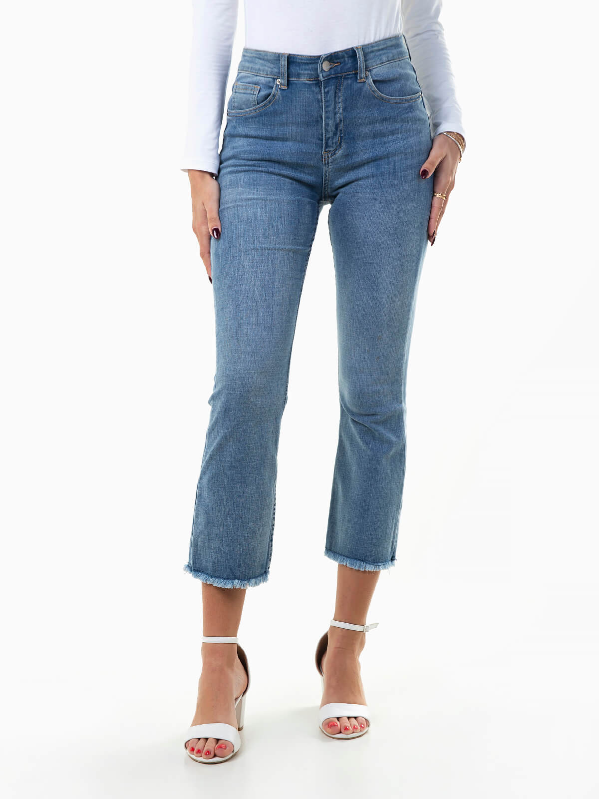 Jeans cropped à boca de sino para senhora. Calças ganga elástica com cintura alta e lavagem azul claro. Base desfiada. 5 bolsos. Aperto fecho éclair e botão.