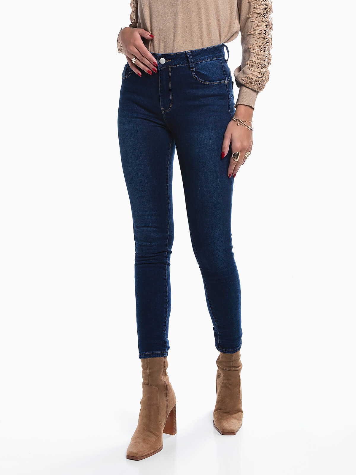 Jeans com efeito push-up e lavagem azul escuro. Calças ganga justas com cintura alta. 5 bolsos. Aperto fecho éclair e botão.