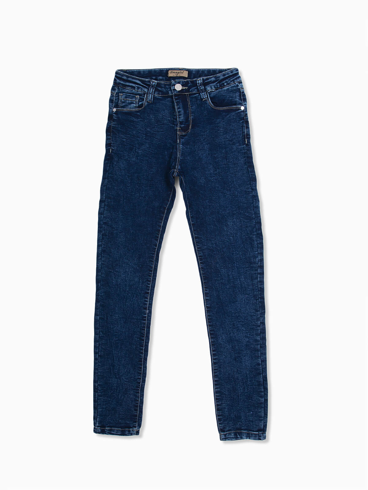 Jeans elásticas com lavagem manchada para menina. Calças de ganga de cintura média. 5 bolsos. Aperto de fecho éclair e botão.