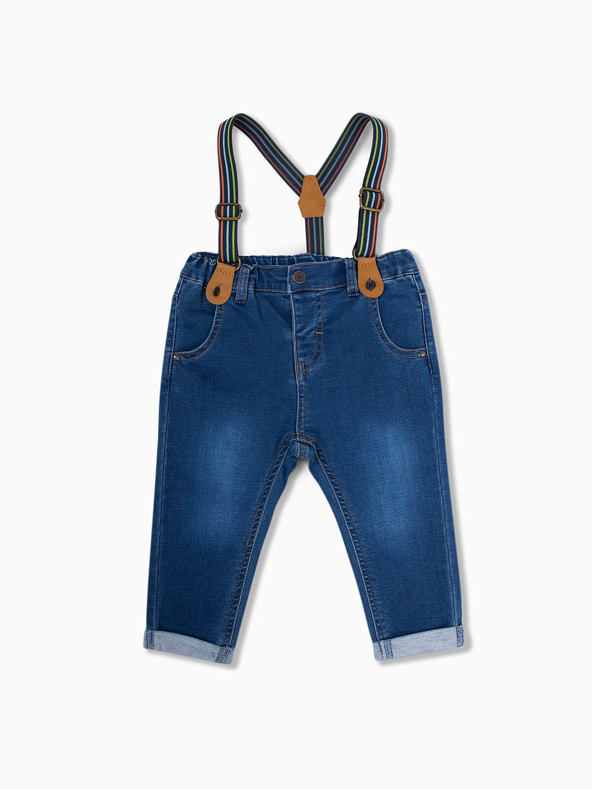 Jeans com estampado de monstro no bolso. Calças ganga elásticas lavagem azul claro para bebé menino. Ajustador no interior. Aperto de botão mola. 4 bolsos. Suspensórios removíveis.