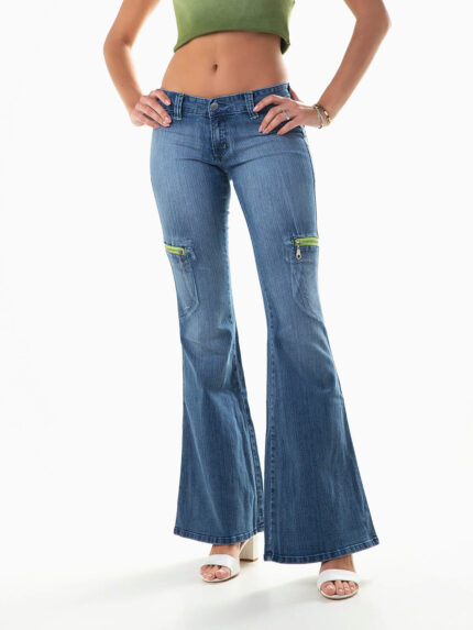 Calças ganga cargo à boca de sino para senhora. Jeans de cintura alta com lavagem azul escuro. 6 bolsos. Aperto fecho zíper e botão.