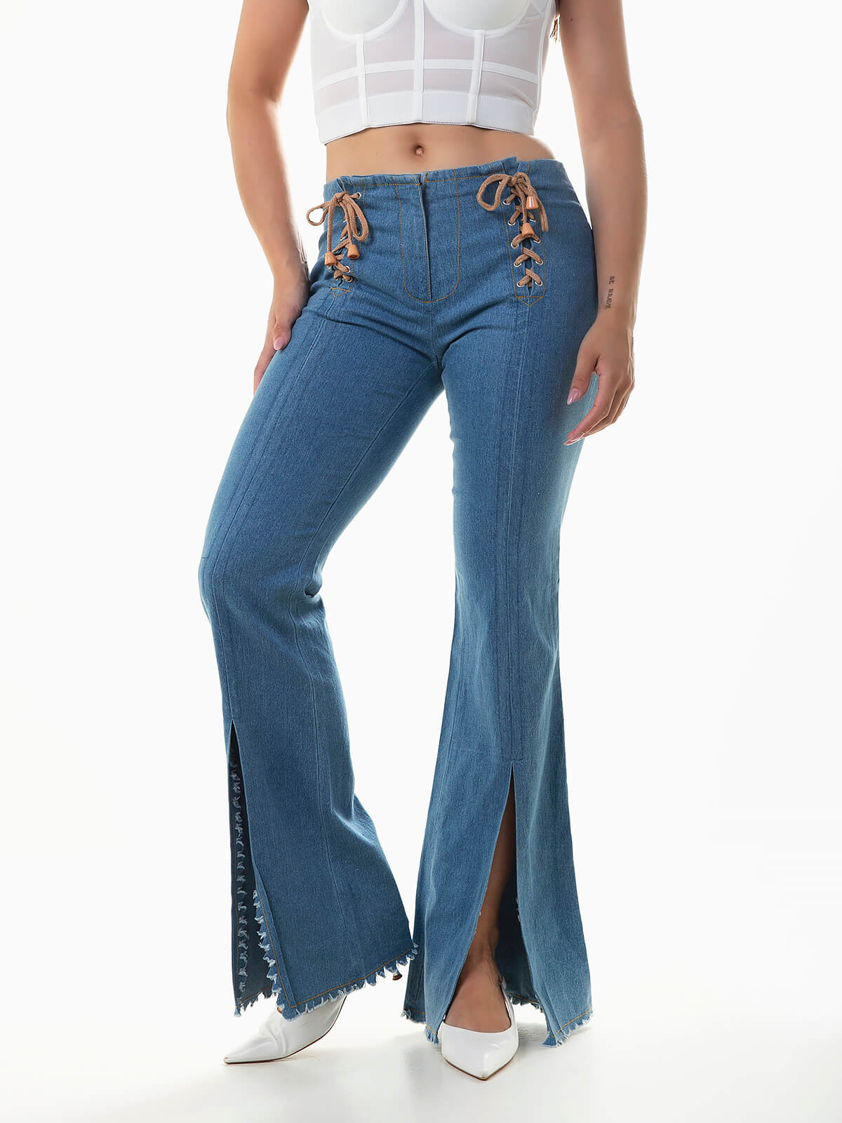 Jeans flare com aberturas na base e pormenores desfiados. Calças ganga de cintura baixa com cordões ajustáveis e aperto de fecho zíper. Lavagem azul escuro.