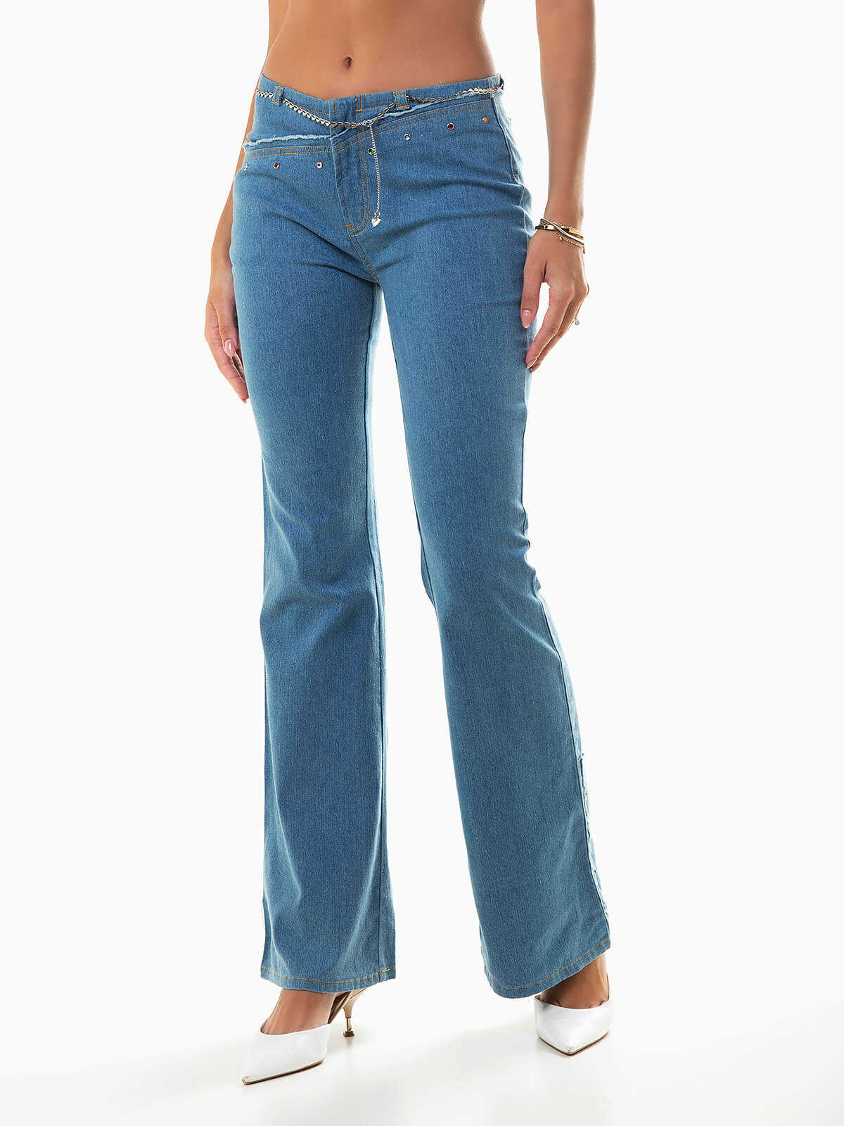 Jeans flare com aplicações de pedras brilhantes coloridas. Calças ganga cintura baixa com corrente removível. Lavagem azul claro. Aperto fecho zíper.
