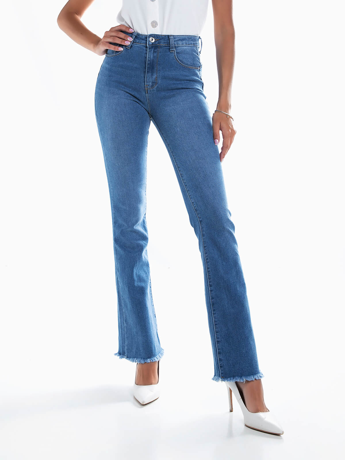 Jeans flare com efeito push-up para senhora. Calças ganga de cintura alta com base desfiada. Lavagem azul claro. 5 bolsos. Aperto de fecho éclair e botão.